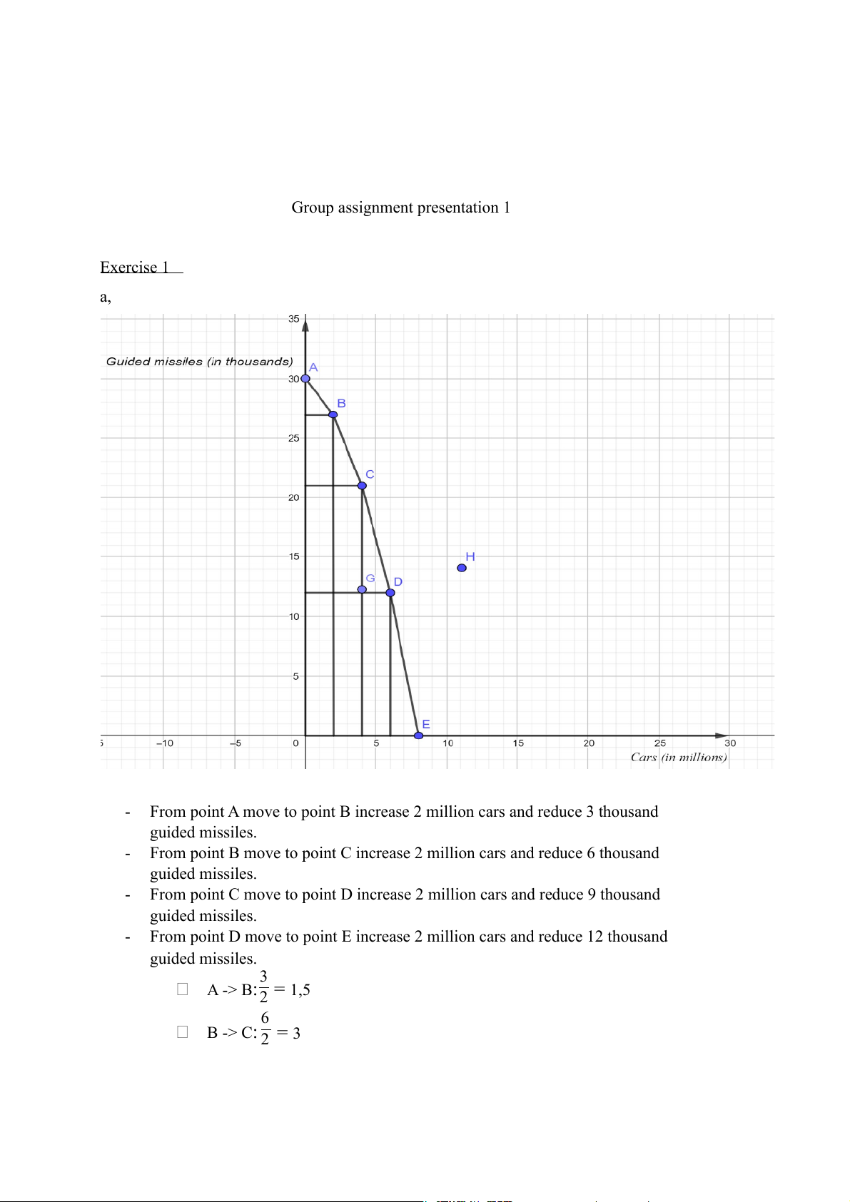 From point D move to point E increase 2 million cars and reduce 12 thousand guided missiles. 3 A -> B: 2 = 1,5 6 B -> C: 2 = 3 C -> D: 92 = 4,5 12 D -> E: 2 = 6