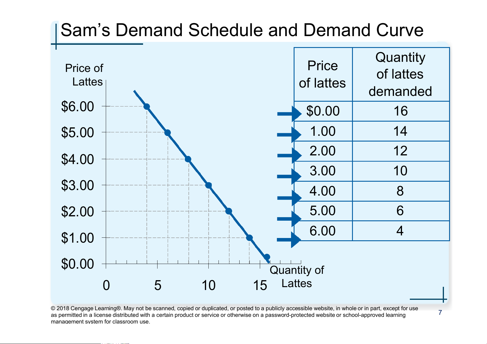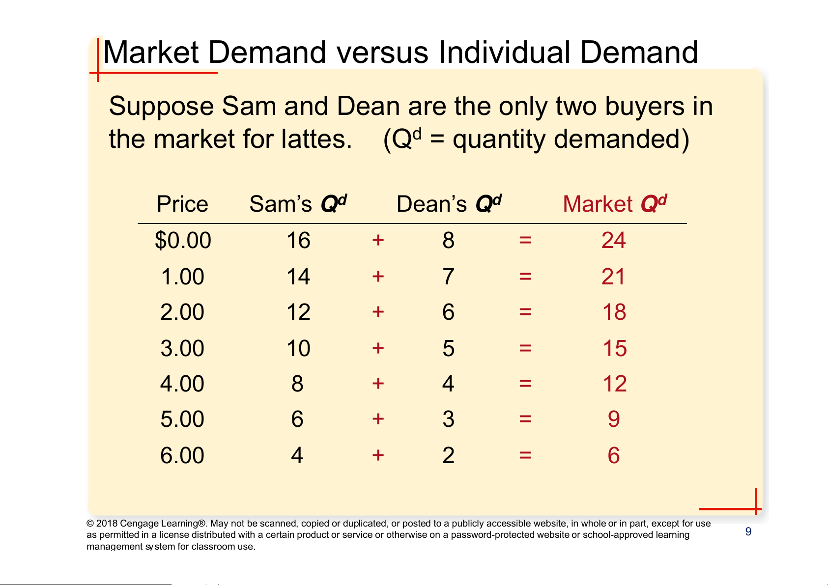 the market for lattes. (Qd = quantity demanded) Price Sam’s Qd Dean’s Qd Market Qd $0.00 16 + 8 = 24 1.00 14 + 7 = 21 2.00 12 + 6 = 18 3.00 10 + 5 = 15 4.00 8 + 4 = 12 5.00 6 + 3 = 9 6.00 4 + 2 = 6