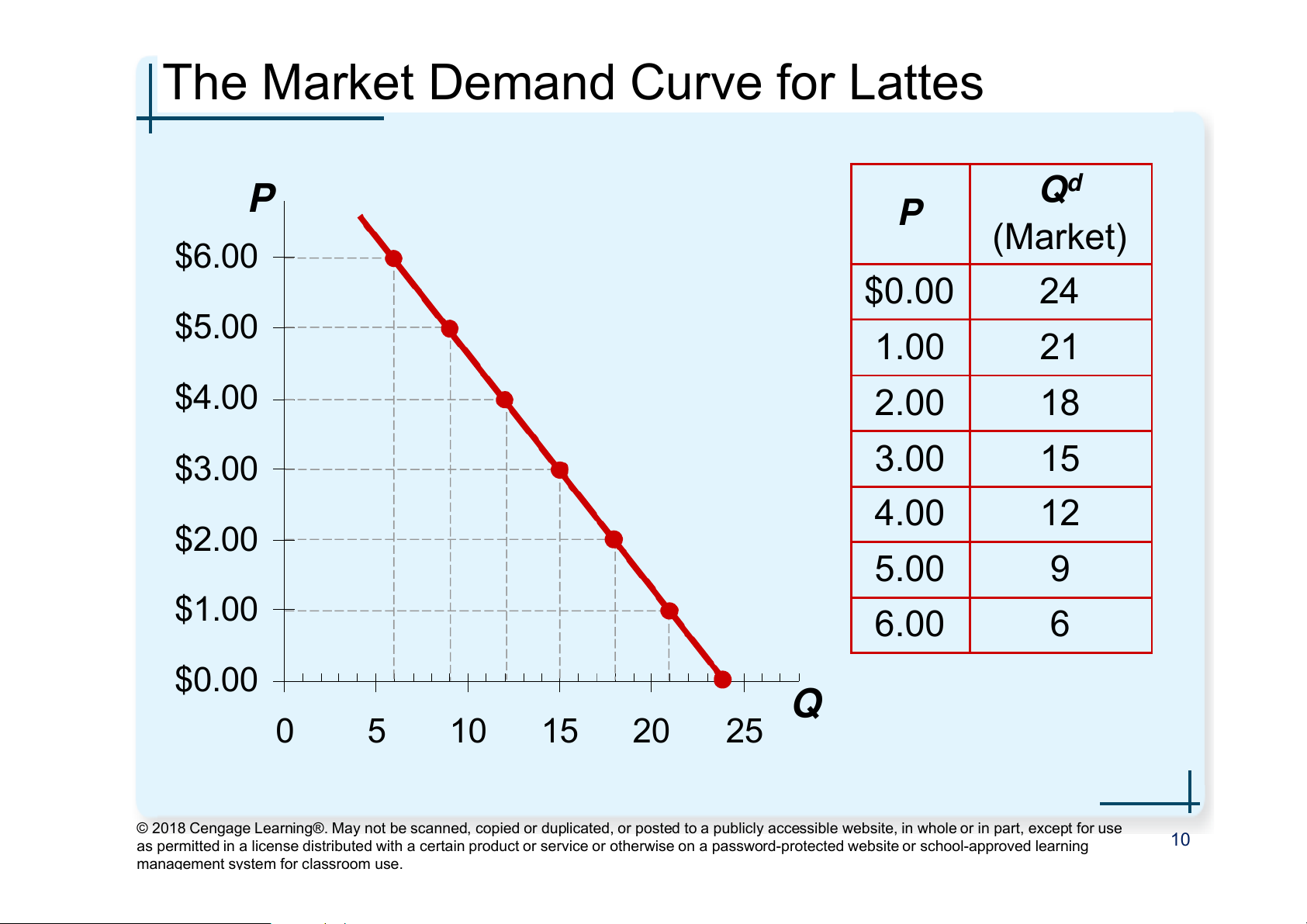 The Market Demand Curve for Lattes P P Qd (Market) $6.00 $0.00 24 $5.00 1.00 21 $4.00 2.00 18 $3.00 3.00 15 4.00 12 $2.00 5.00 9 $1.00 6.00 6 $0.00 Q 0 5 10 15 20 25
