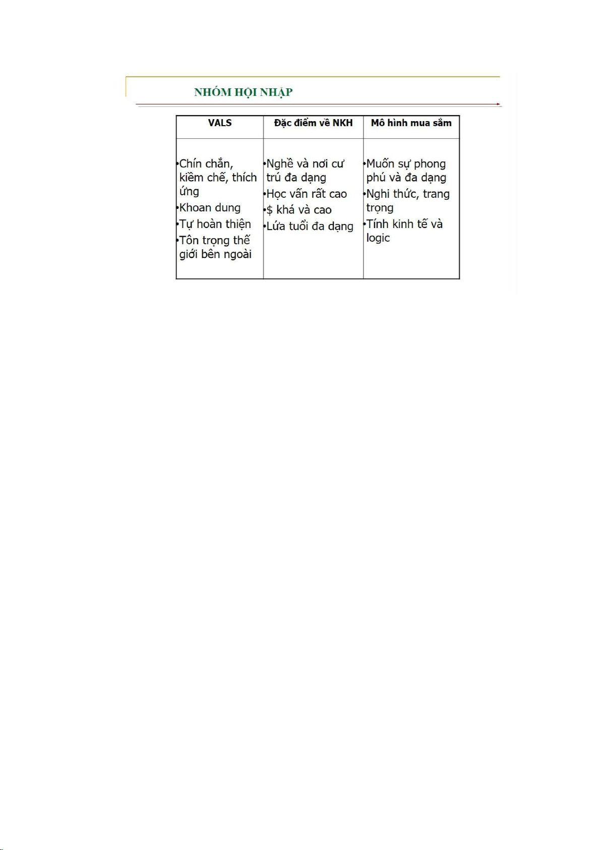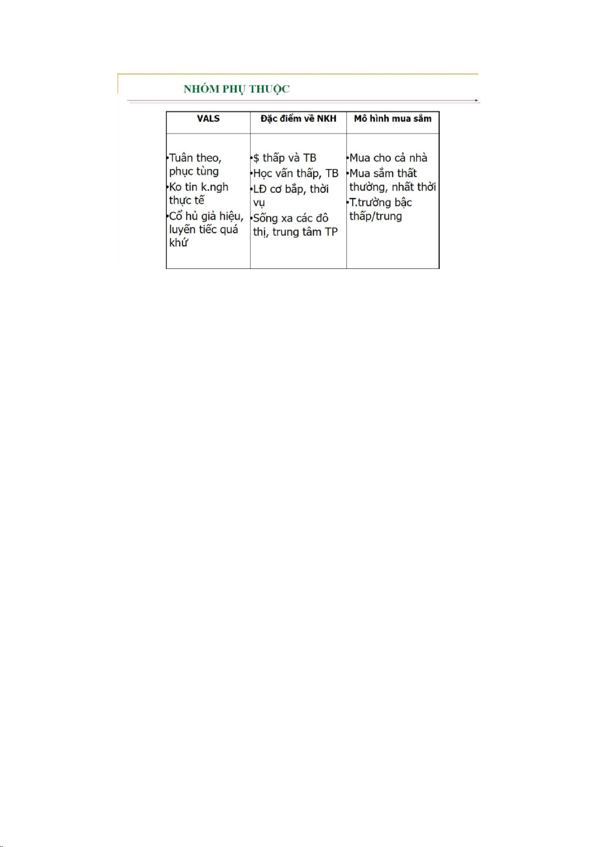 Dựa trên đoạn văn và bảng đặc trưng cá tính VALS trong ảnh, nhóm có thể nhận thấy