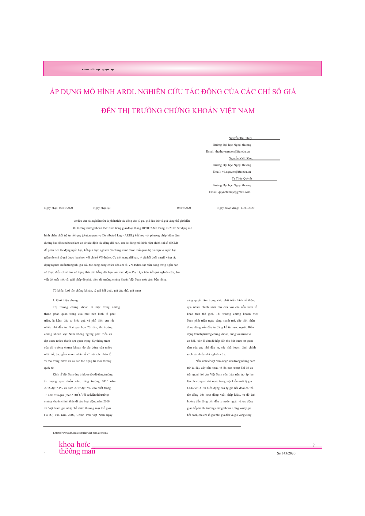 1. Nguyễn Thu Thuỷ, Nguyễn Việt Dũng và Tạ Thúy Quỳnh - Áp dụng mô hình ARDL nghiên cứu