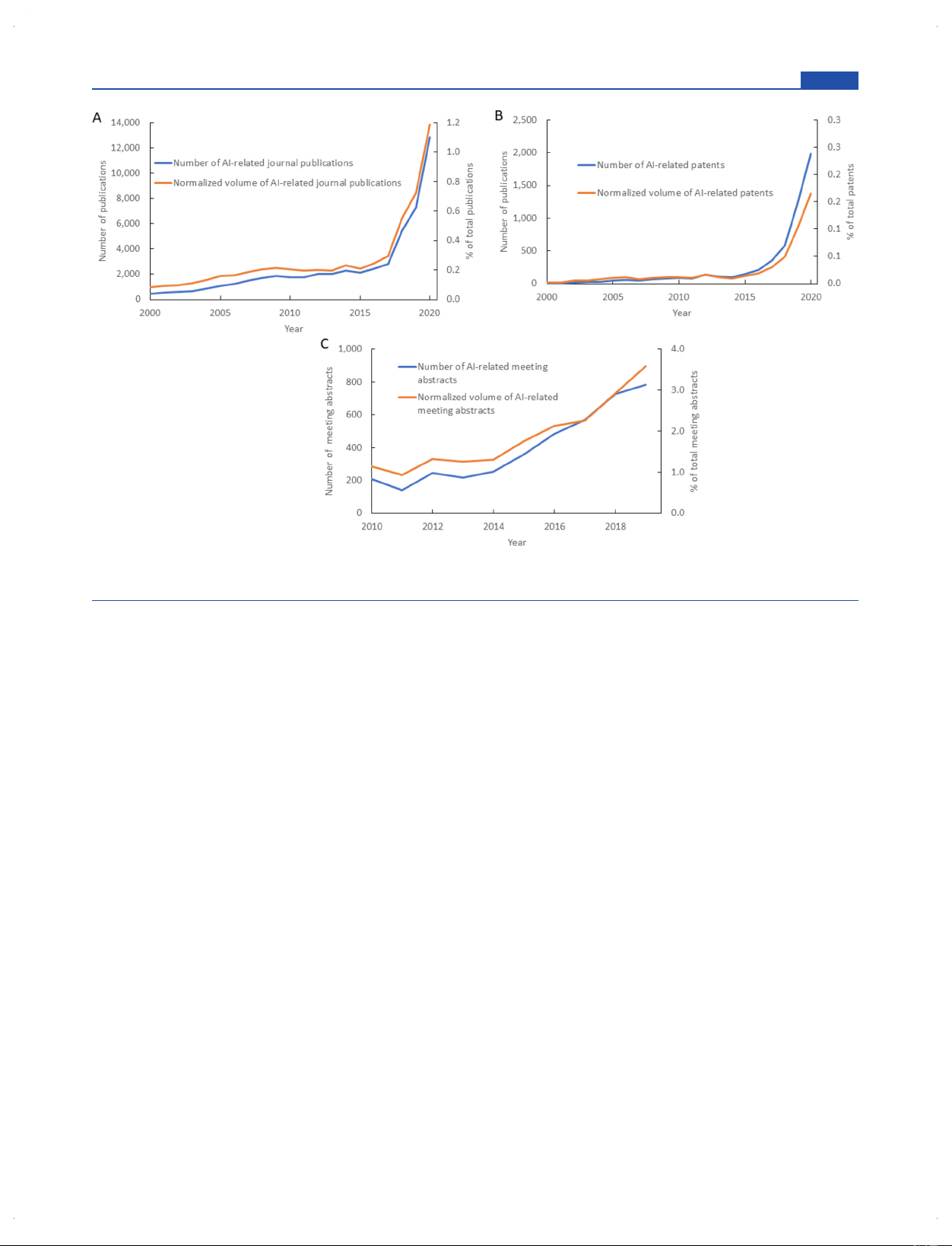Figure 1. Annual publication volume in AI-related chemistry from 2000 to 2020: (A) Journal publications, (B) patent publications, and (C) ACS National Meeting abstracts.