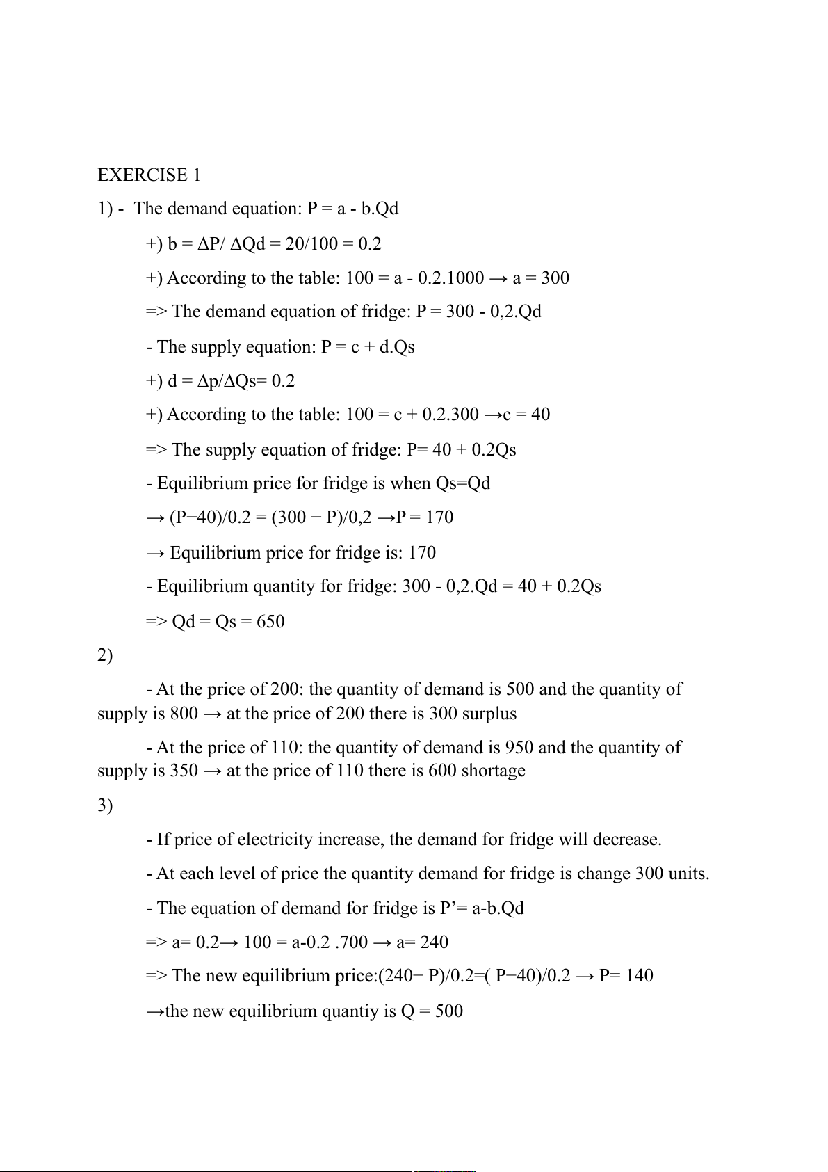 - Equilibrium quantity for fridge: 300 - 0,2.Qd = 40 + 0.2Qs => Qd = Qs = 650 2)