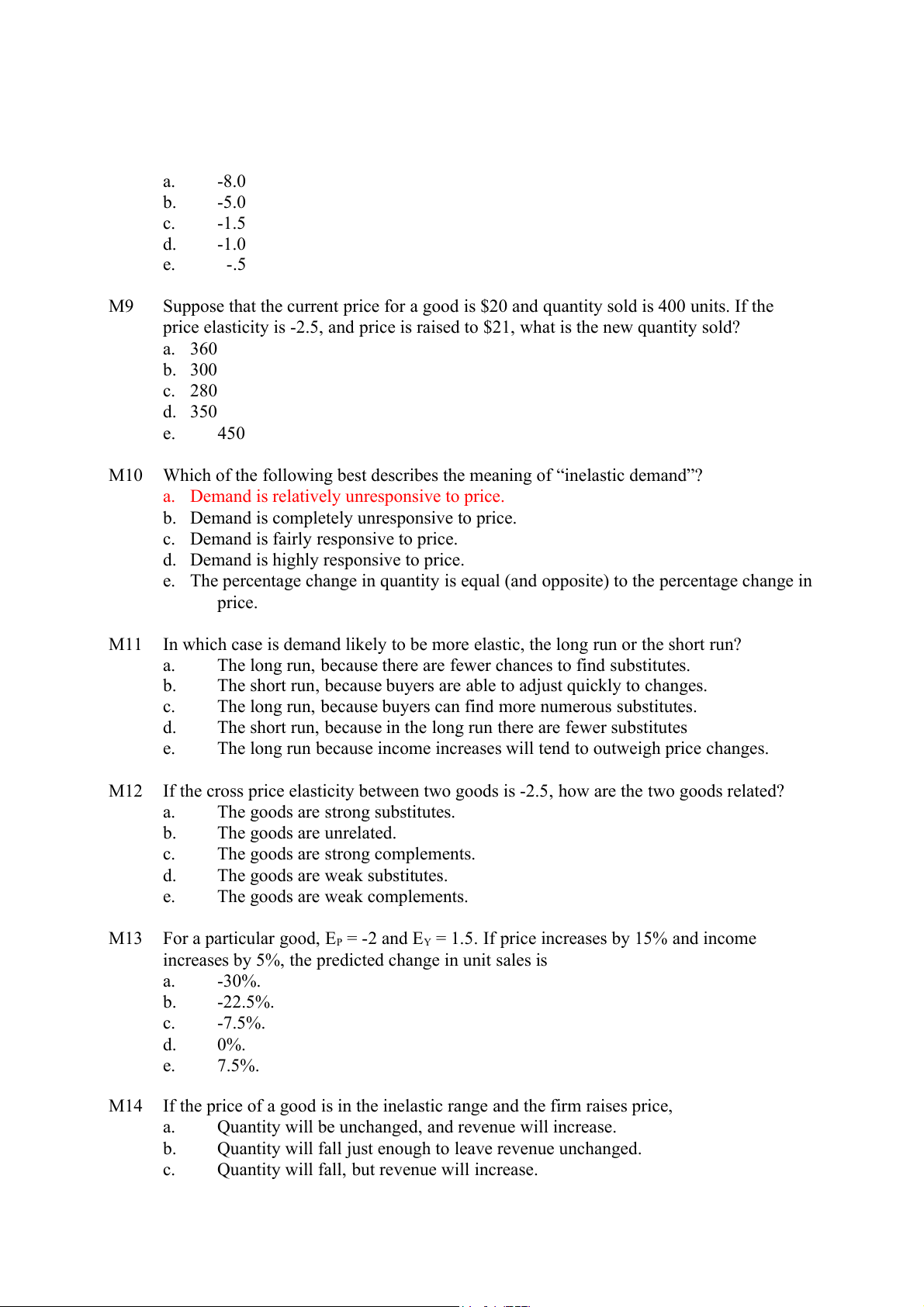 fall to 350 units. The point elasticity at P = $15 is a. -1.25. b. -1.00. c. -.625. d. -.50. e. -.22. M8