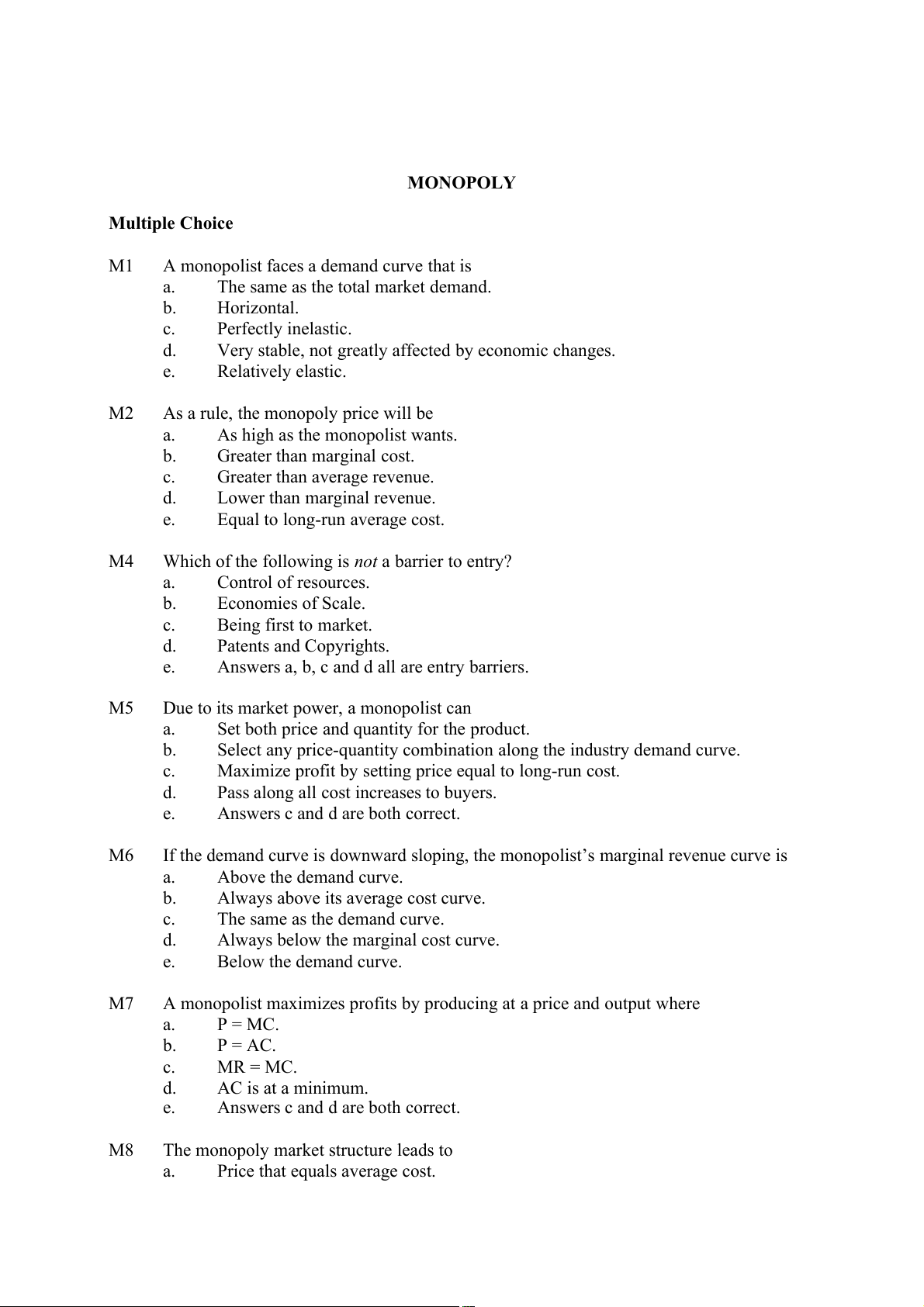 As high as the monopolist wants. b. Greater than marginal cost. c. Greater than average revenue. d. Lower than marginal revenue. e.