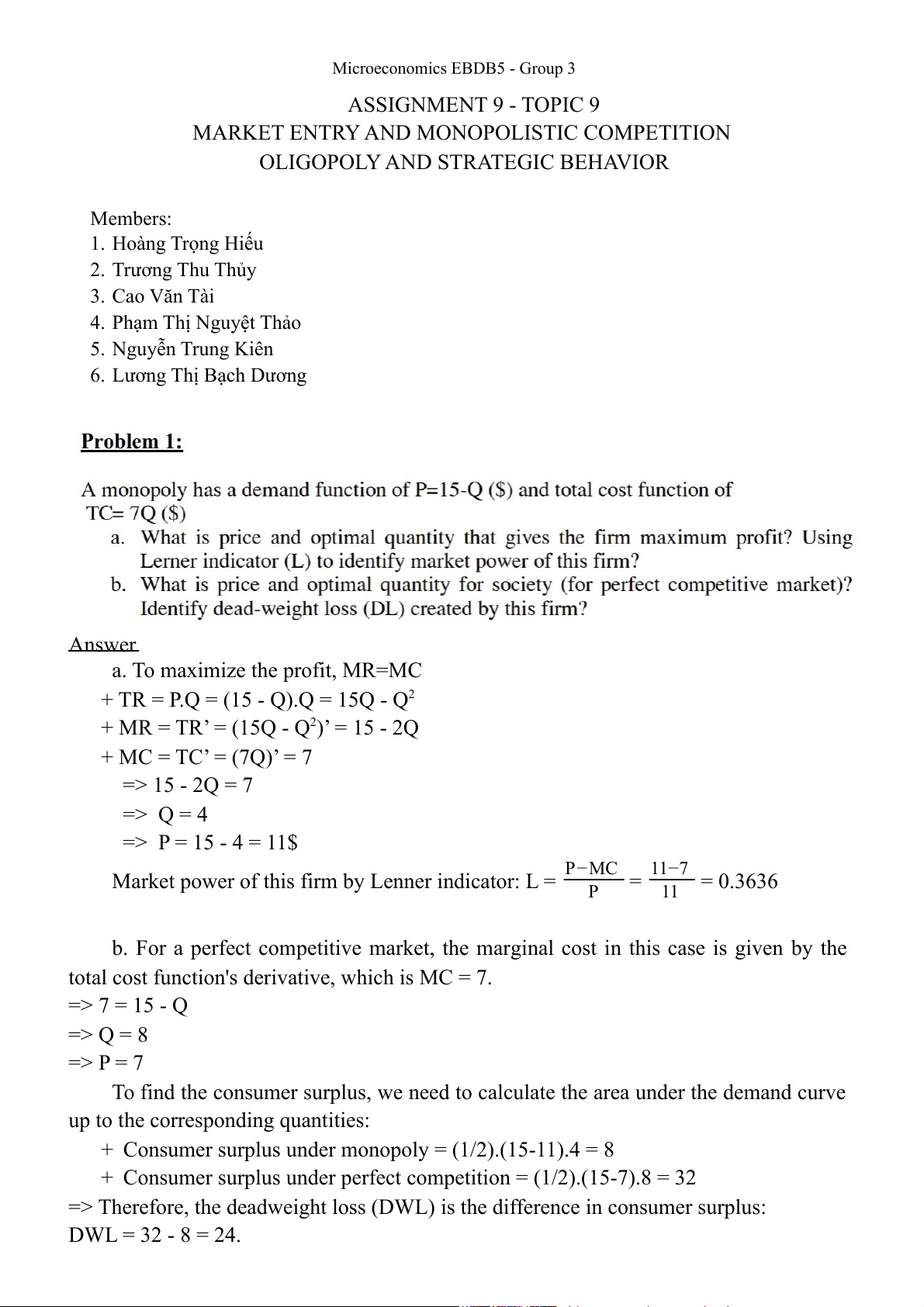 Microeconomics EBDB5 - Group 3 ASSIGNMENT 9 - TOPIC 9