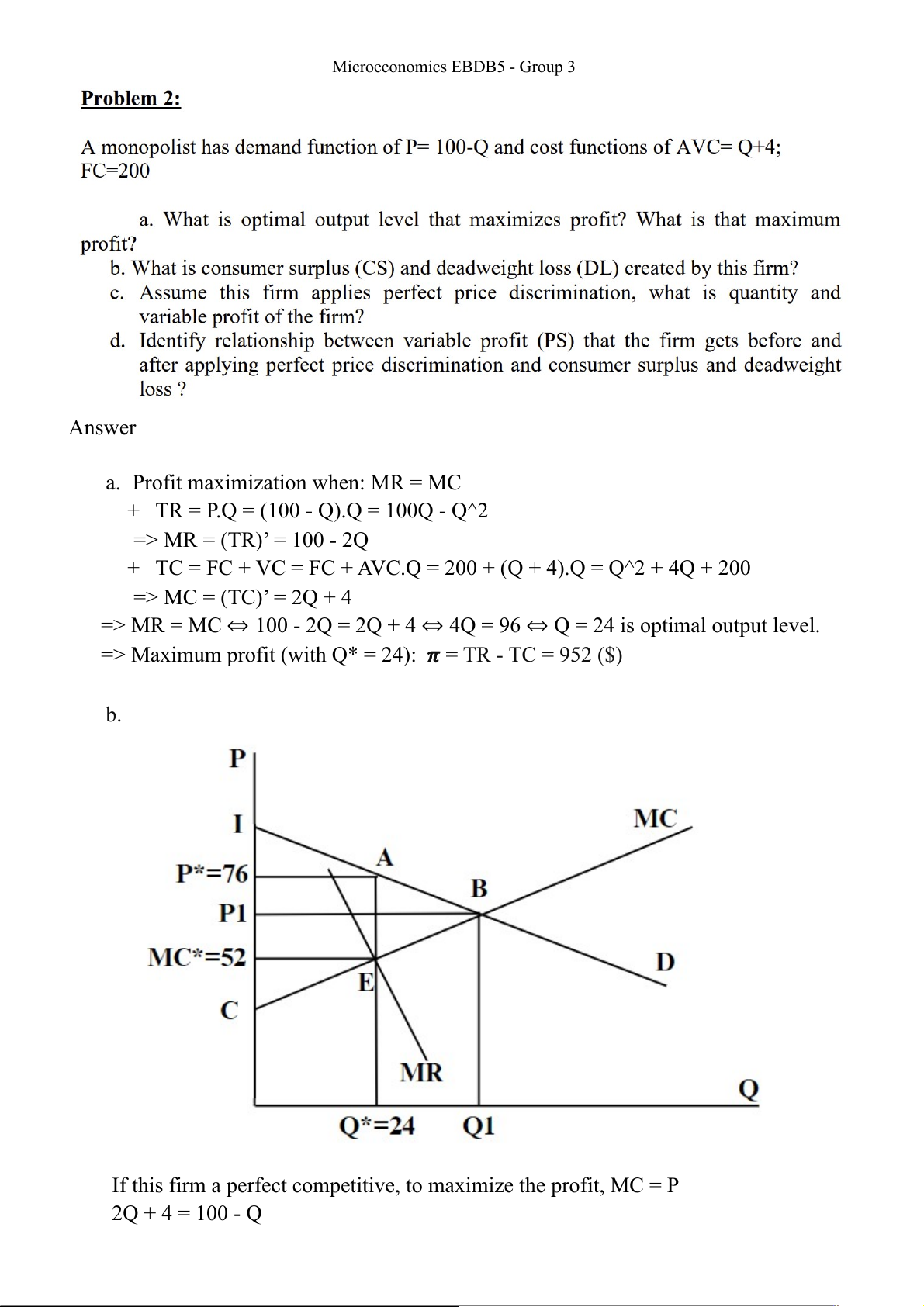 If this firm a perfect competitive, to maximize the profit, MC = P 2Q + 4 = 100 - Q Microeconomics EBDB5 - Group 3 ⇔ Q1 = 32 ⇔ P1 = 68