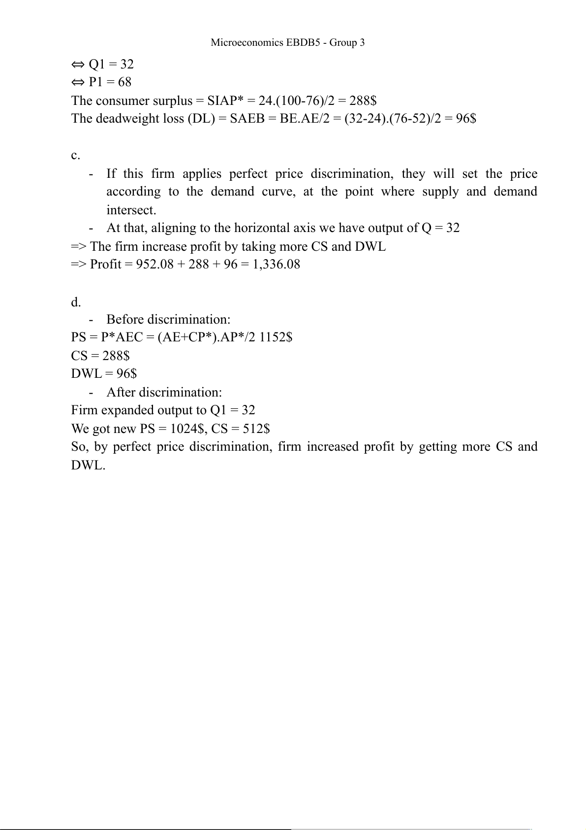 => Profit = 952.08 + 288 + 96 = 1,336.08 d. - Before discrimination: