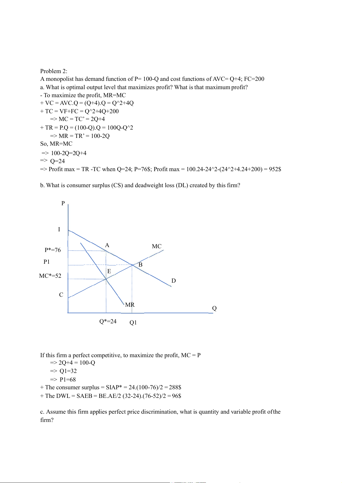 b. What is consumer surplus (CS) and deadweight loss (DL) created by this firm? P I A MC P*=76 P1 B E MC*=52 D C MR Q Q*=24 Q1