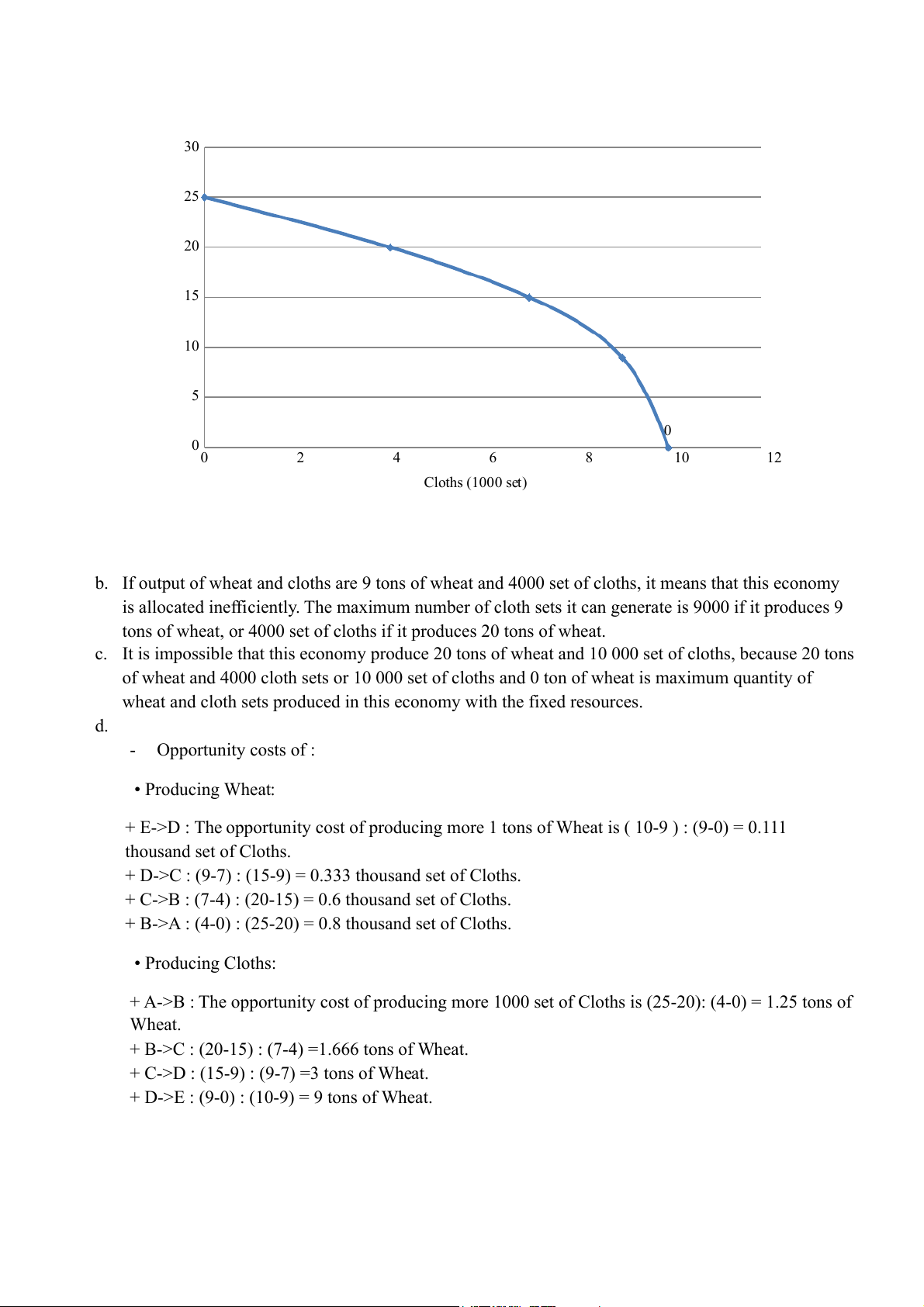 + A->B : The opportunity cost of producing more 1000 set of Cloths is (25-20): (4-0) = 1.25 tons of Wheat.