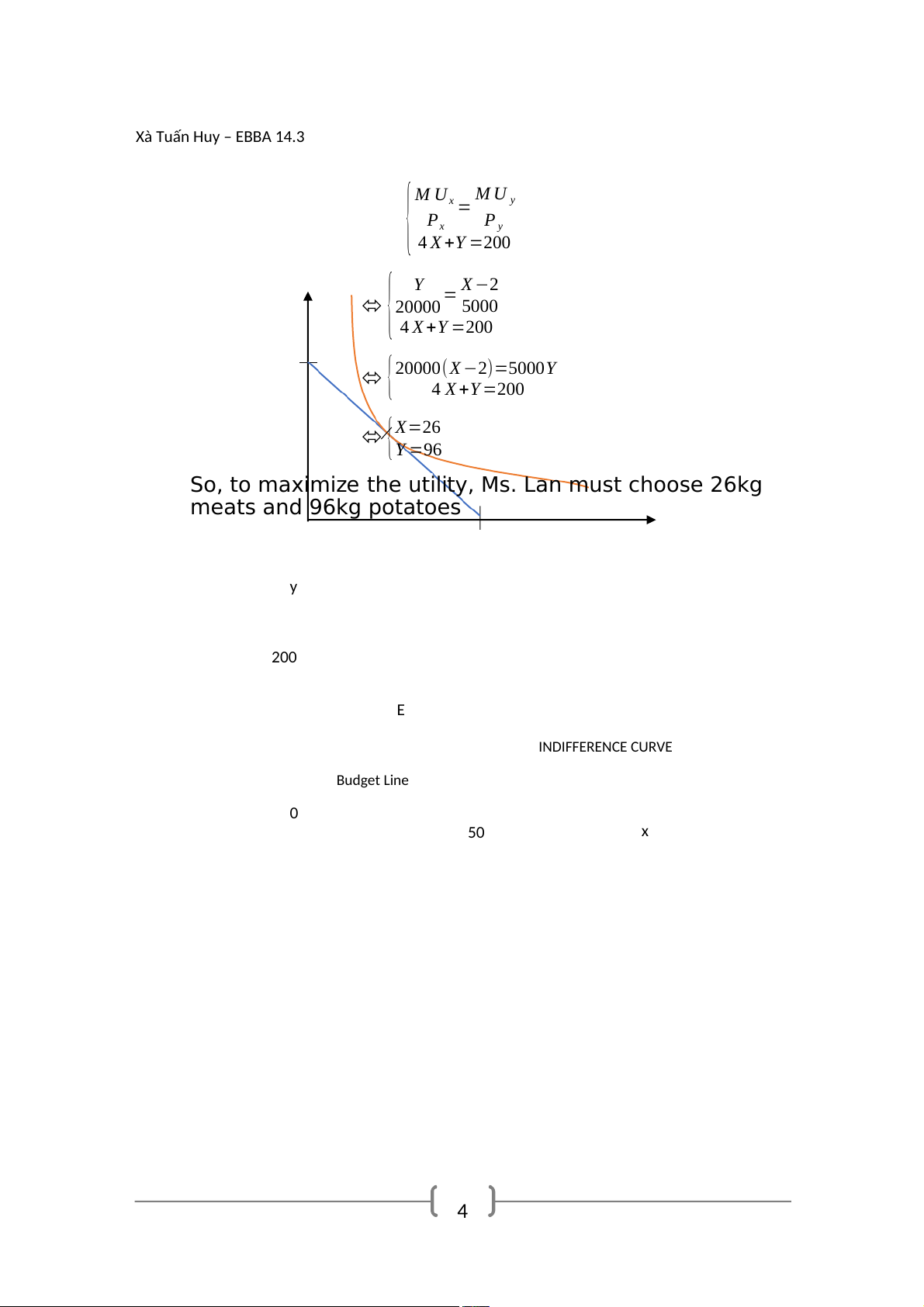 So, to maximize the utility, Ms. Lan must choose 26kg meats and 96kg potatoes y 200 E INDIFFERENCE CURVE Budget Line 0 50 x 4