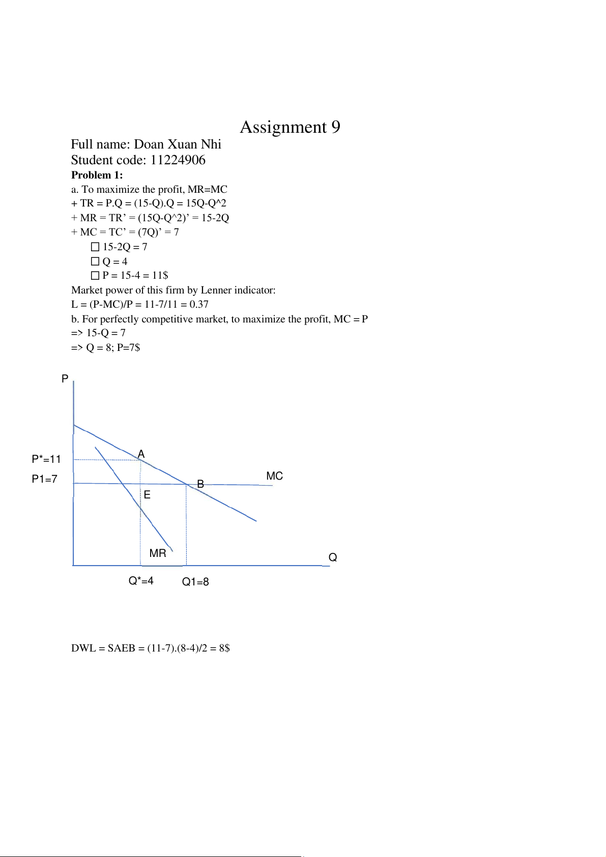 b. For perfectly competitive market, to maximize the profit, MC = P => 15-Q = 7 => Q = 8; P=7$ P P*=11 A P1=7 MC B E MR Q Q*=4 Q1=8