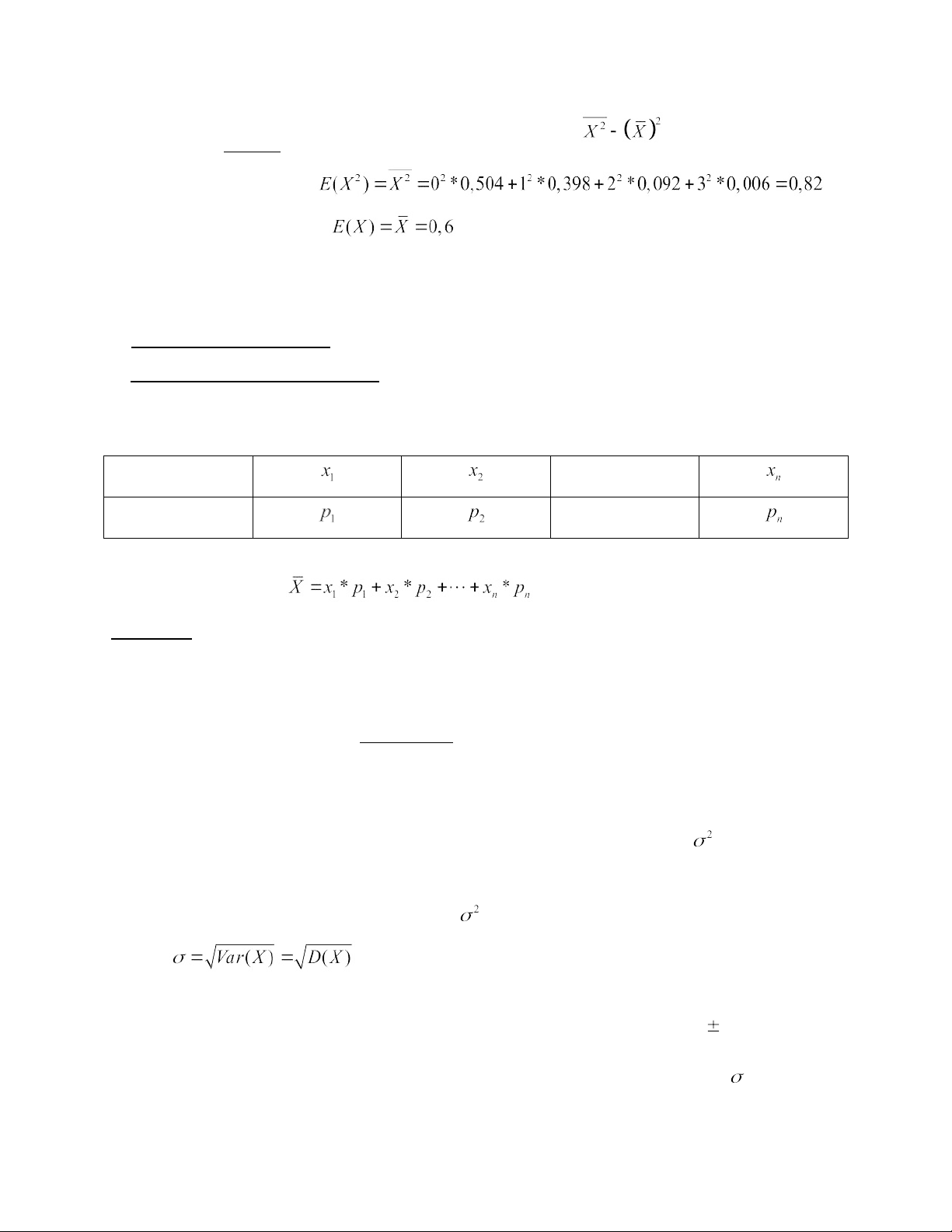 Var(X) = D(X) = (0 – 0,6)2*0,504 + (1 – 0,6)2*0,398 + (2 – 0,6)2*0,092 + (3 – 0,6)2*0,006 = 0,46.