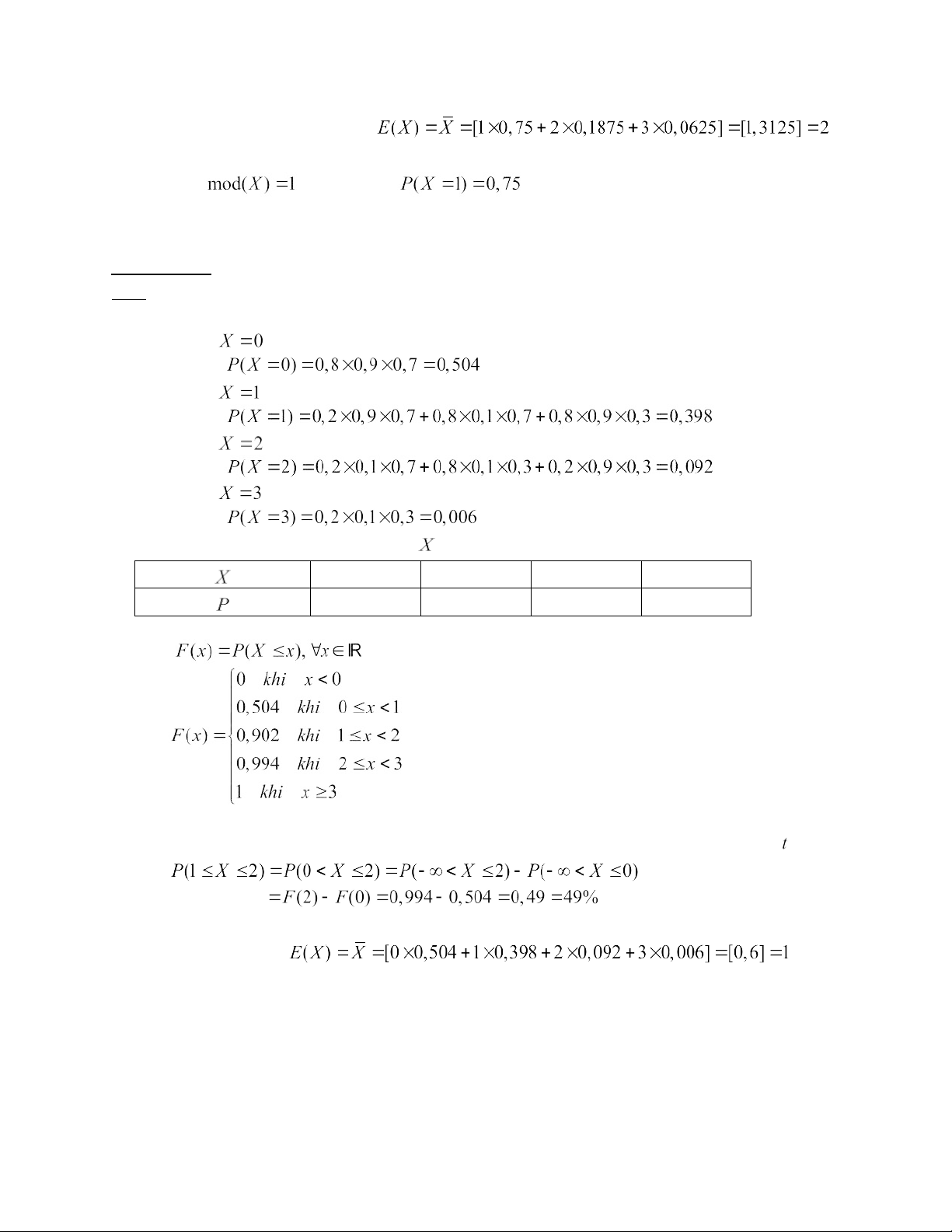 Nên ta có bảng phân phối xác suất của X là X 0 1 2 3 P 0,504 0,398 0,092 0,006