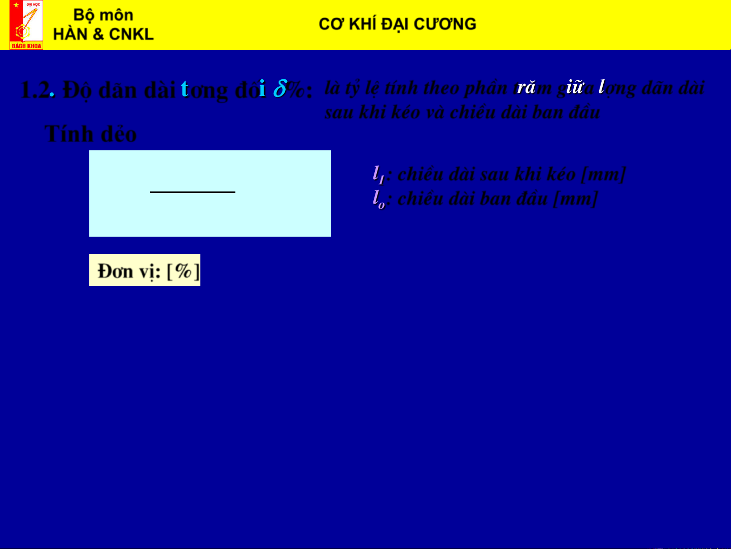 l : chiÒu dµi ban ®Çu [mm] 1 o 0 §¬n vÞ: [%] Bộ môn CƠ KHÍ ĐẠI CƯƠNG Biên soạn: HÀN & CNKL ThS. Vũ Đình Toại 1.3. §é