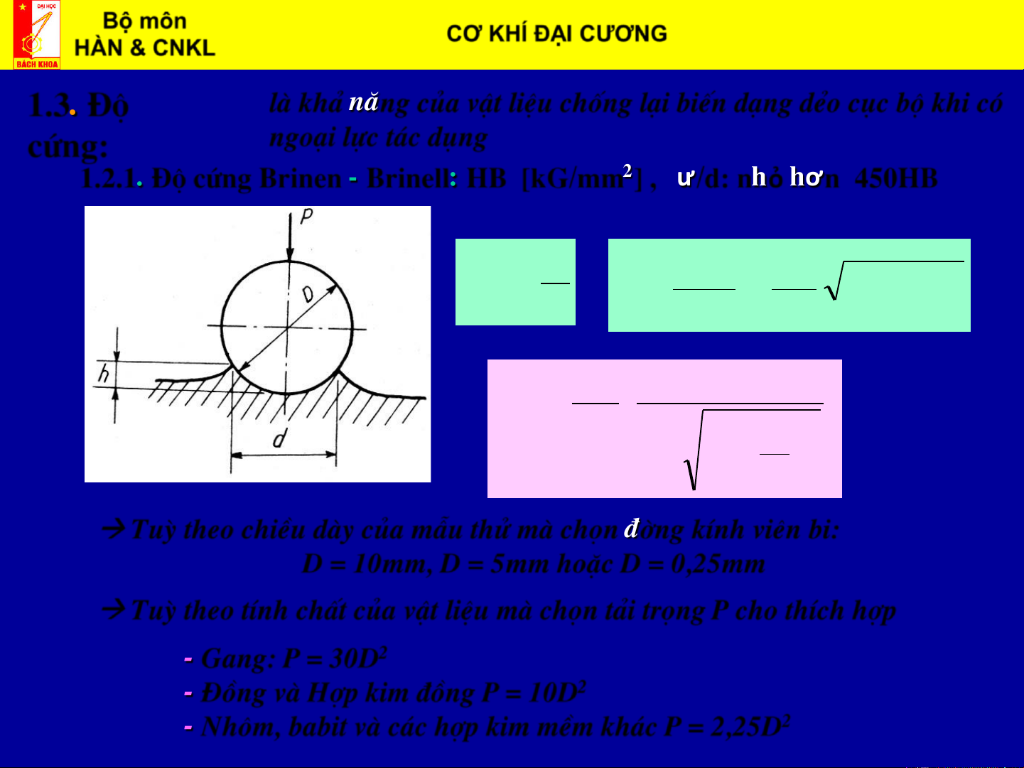 1.2.1. §é cøng Brinen - Brinell: HB [kG/mm2] , ư/d: nhỏ hơn 450HB P 2 D D HB = 2 2 F = − D − d F 2 2 P HB = ( ) 2 D d 1 − 1 − ( ) 2 D