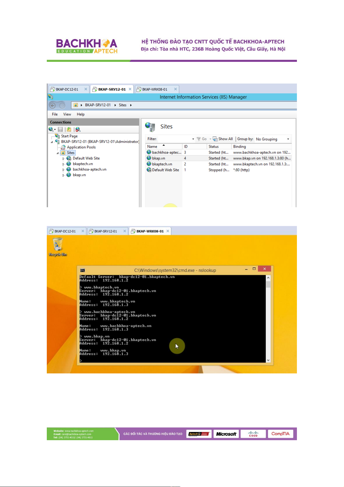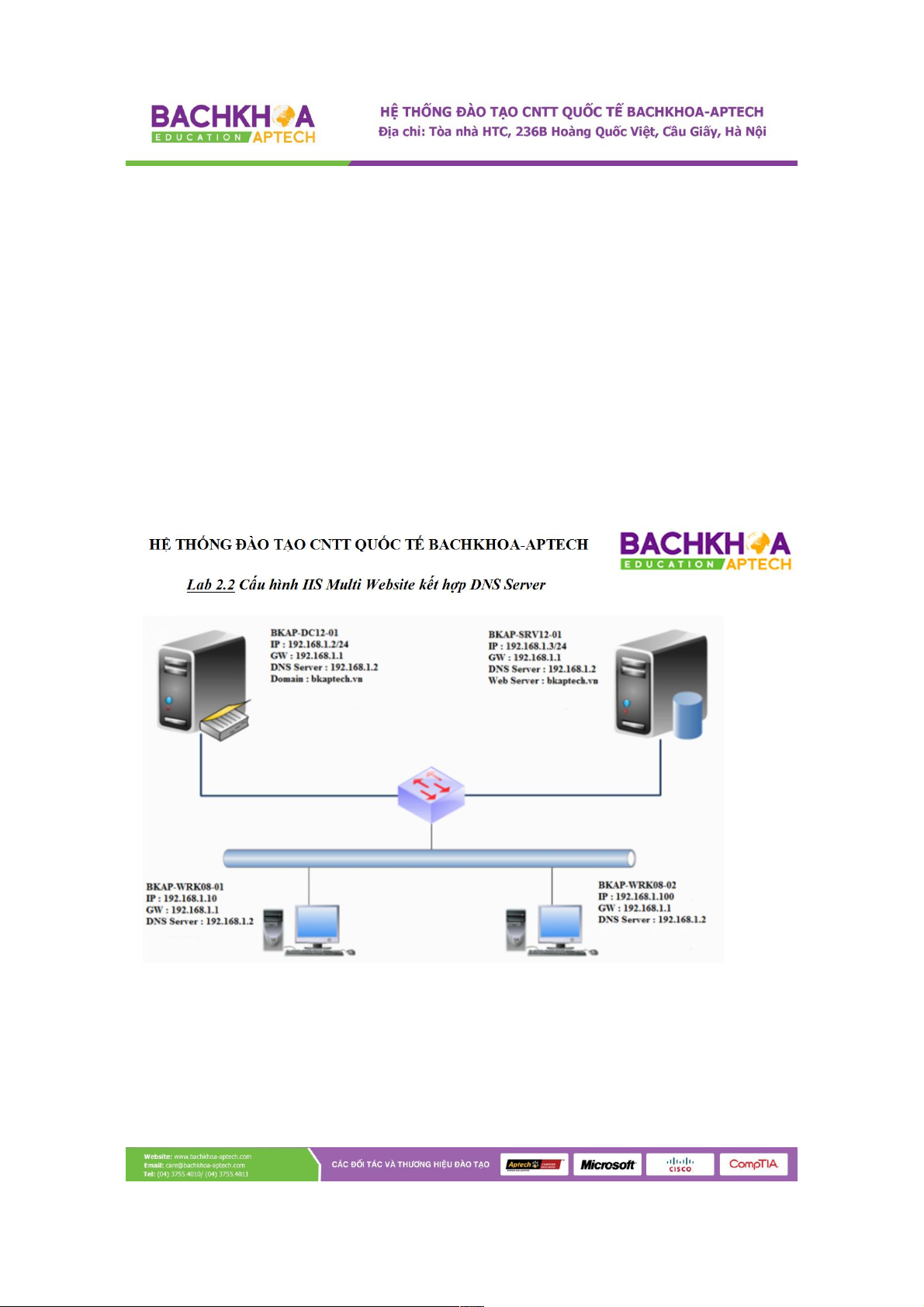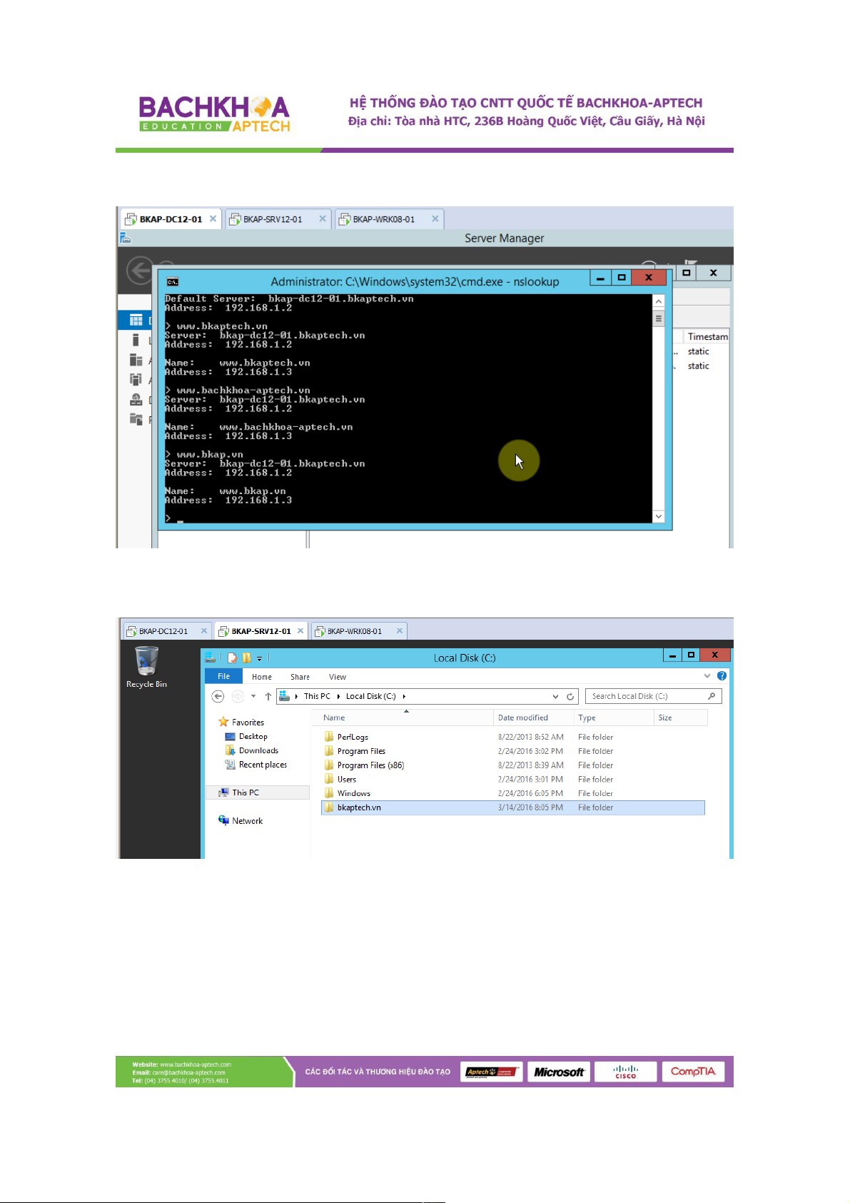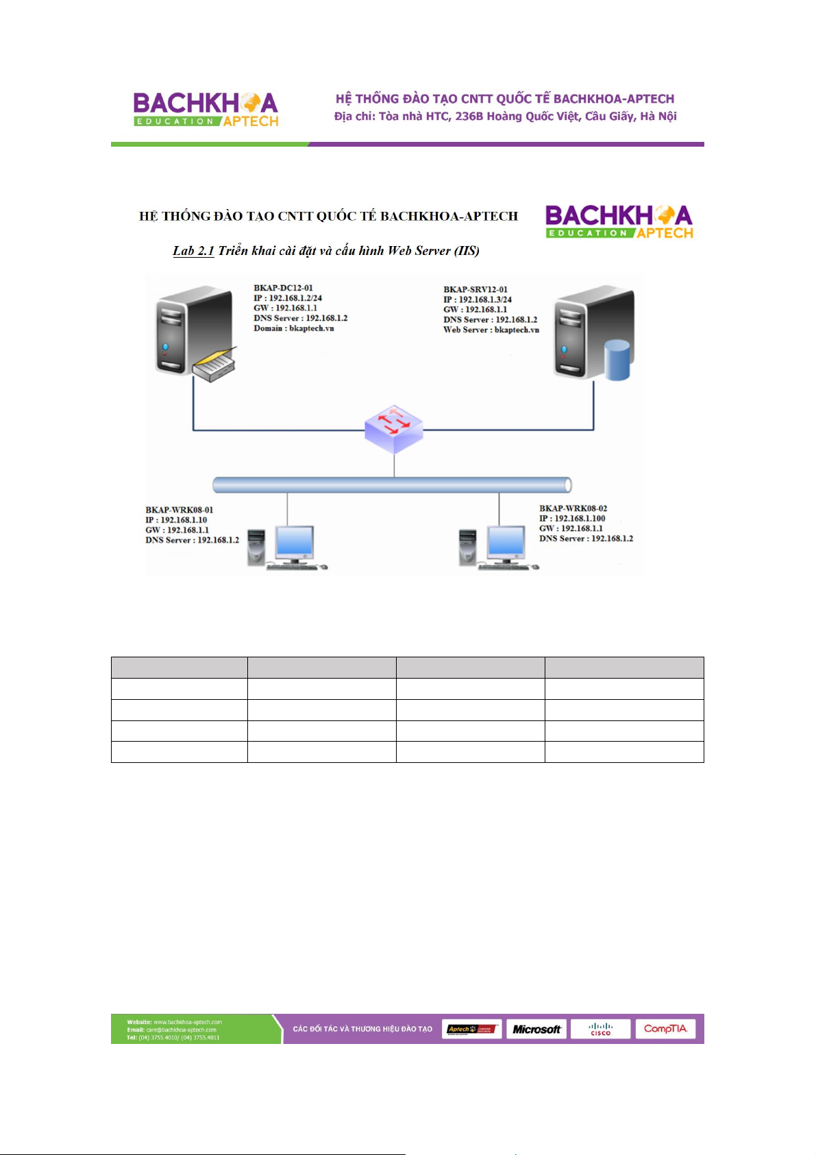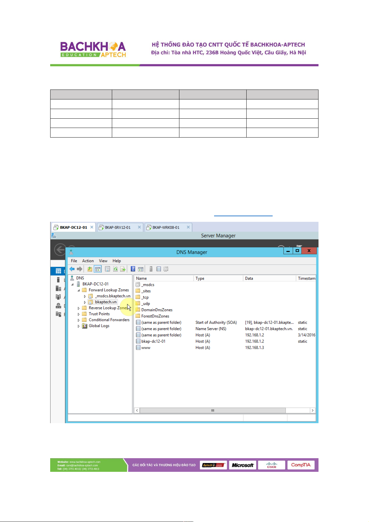 Sơ đồ địa chỉ như sau: Thông số BKAP-DC12-01 BKAP-SRV12-01 BKAP-WRK08-01 IP address 192.168.1.2 192.168.1.3 192.168.1.10 Gateway 192.168.1.1 192.168.1.1 192.168.1.1 Subnet Mask 255.255.255.0 255.255.255.0 255.255.255.0 DNS Server 192.168.1.2 192.168.1.2 192.168.1.2 32