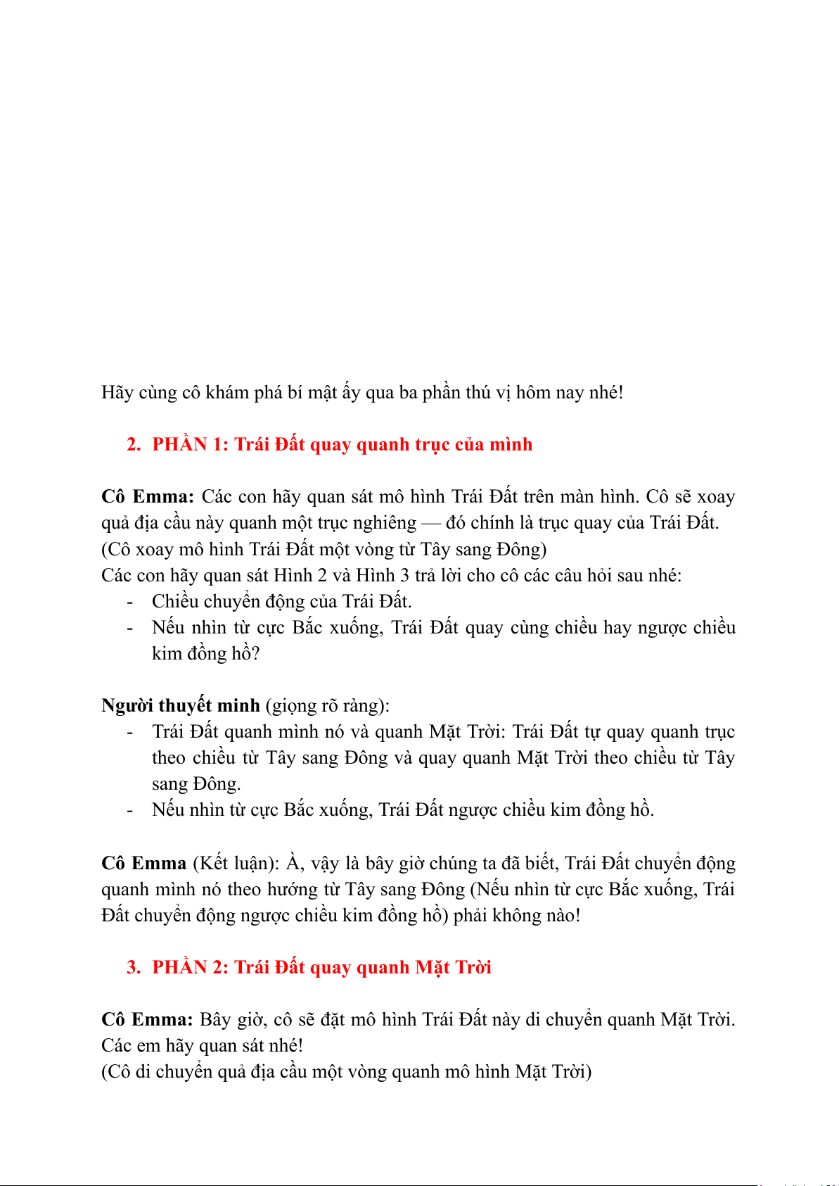 Cô Emma: Đúng vậy! Trái Đất chuyển động quanh Mặt Trời theo chiều từ Tây