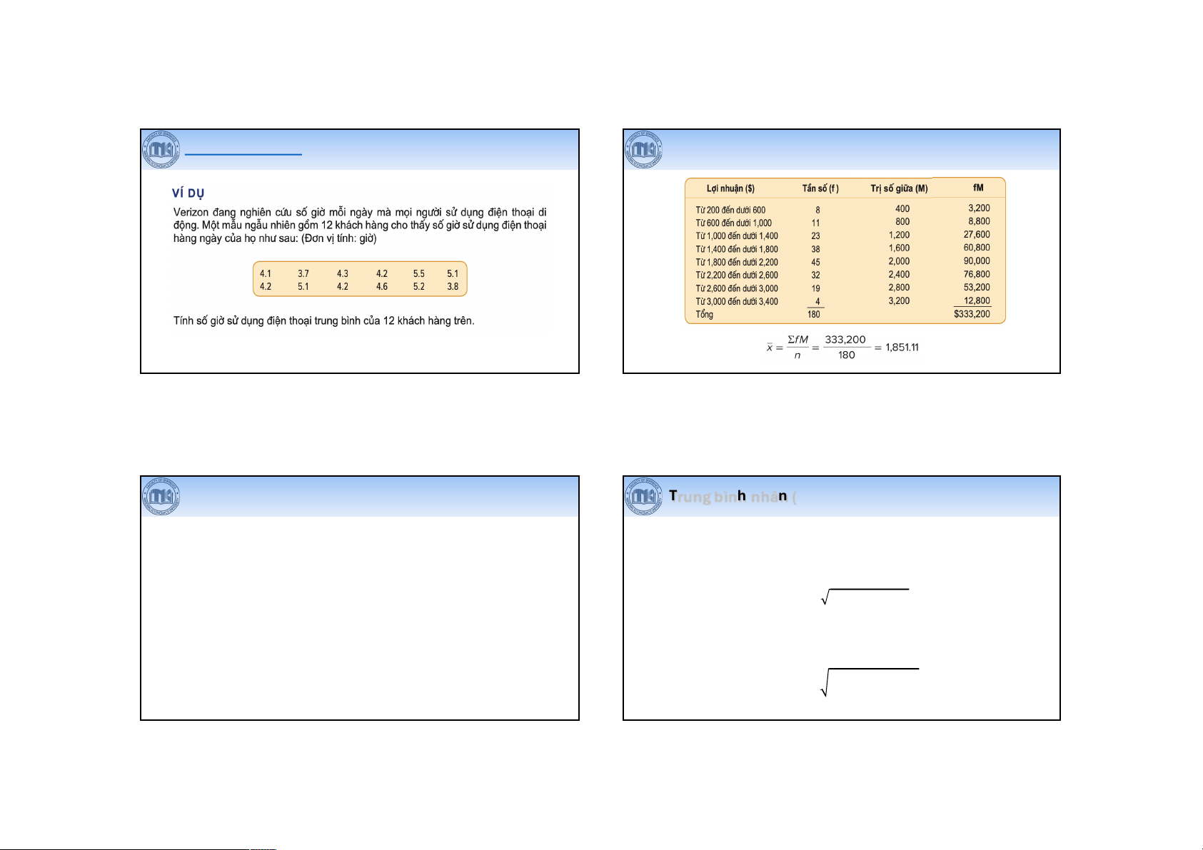 • Nhạy cảm với các giá trị đột xuất (outliers), có thể bị lệch nếu dữ liệu 𝐺M = 𝑥 $ - ) % ×𝑥& × ⋯×𝑥'