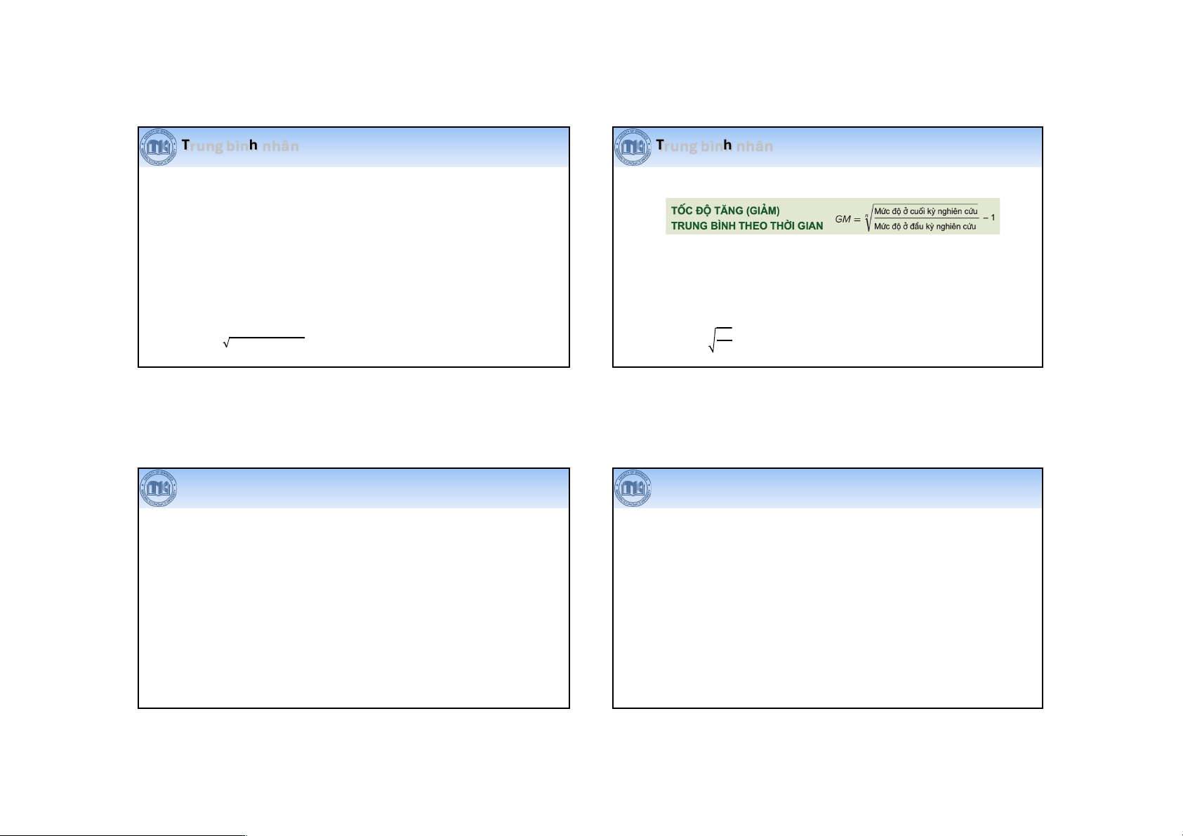 • Trung bình nhân giản đơn (Simple Geometric Mean) • Đặc điểm: