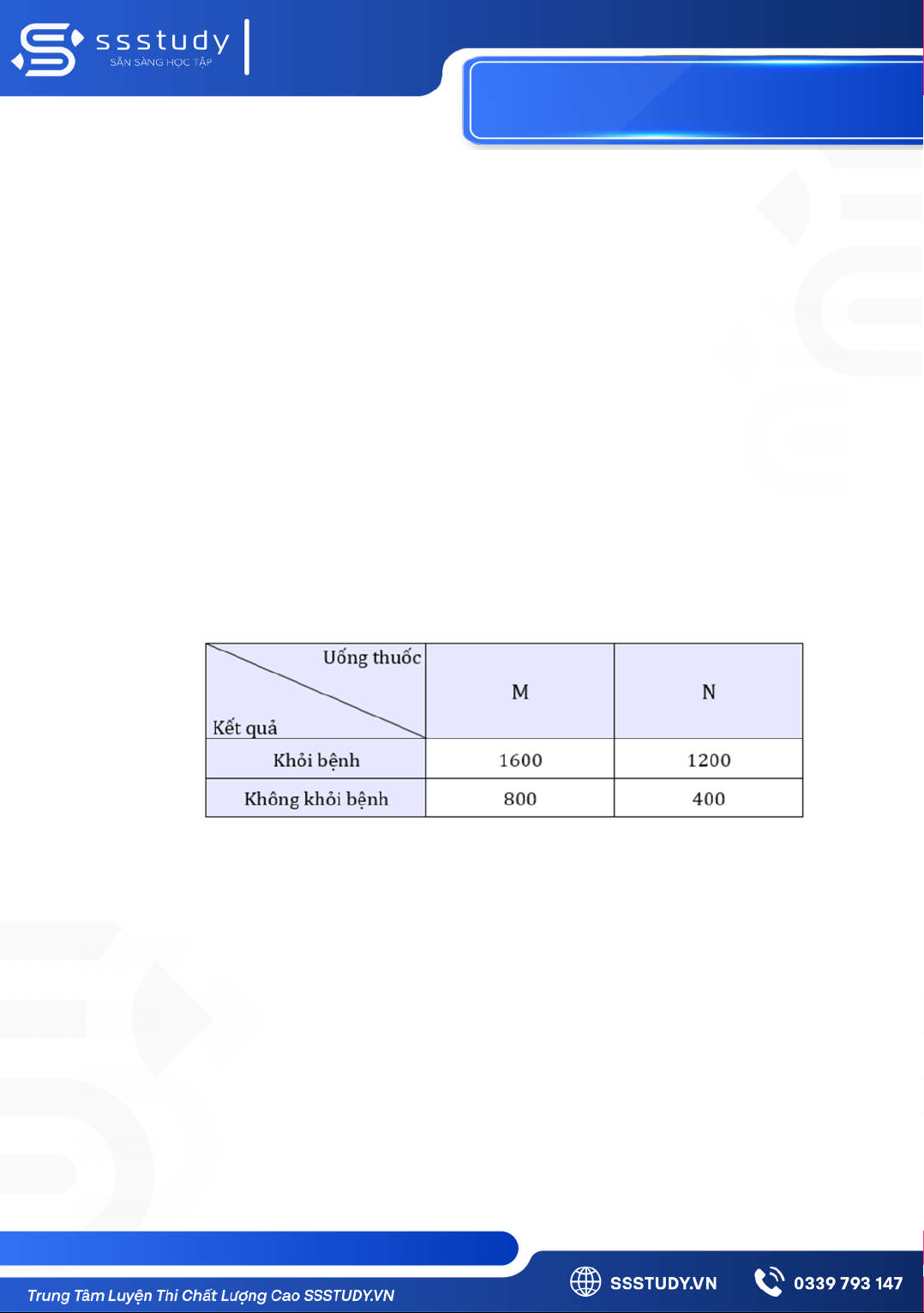 dùng thuốc M, 1600 bệnh nhân còn lại dung thuốc N. Kết quả được cho trong bảng dữ liệu thống kê 2x2 như sau: