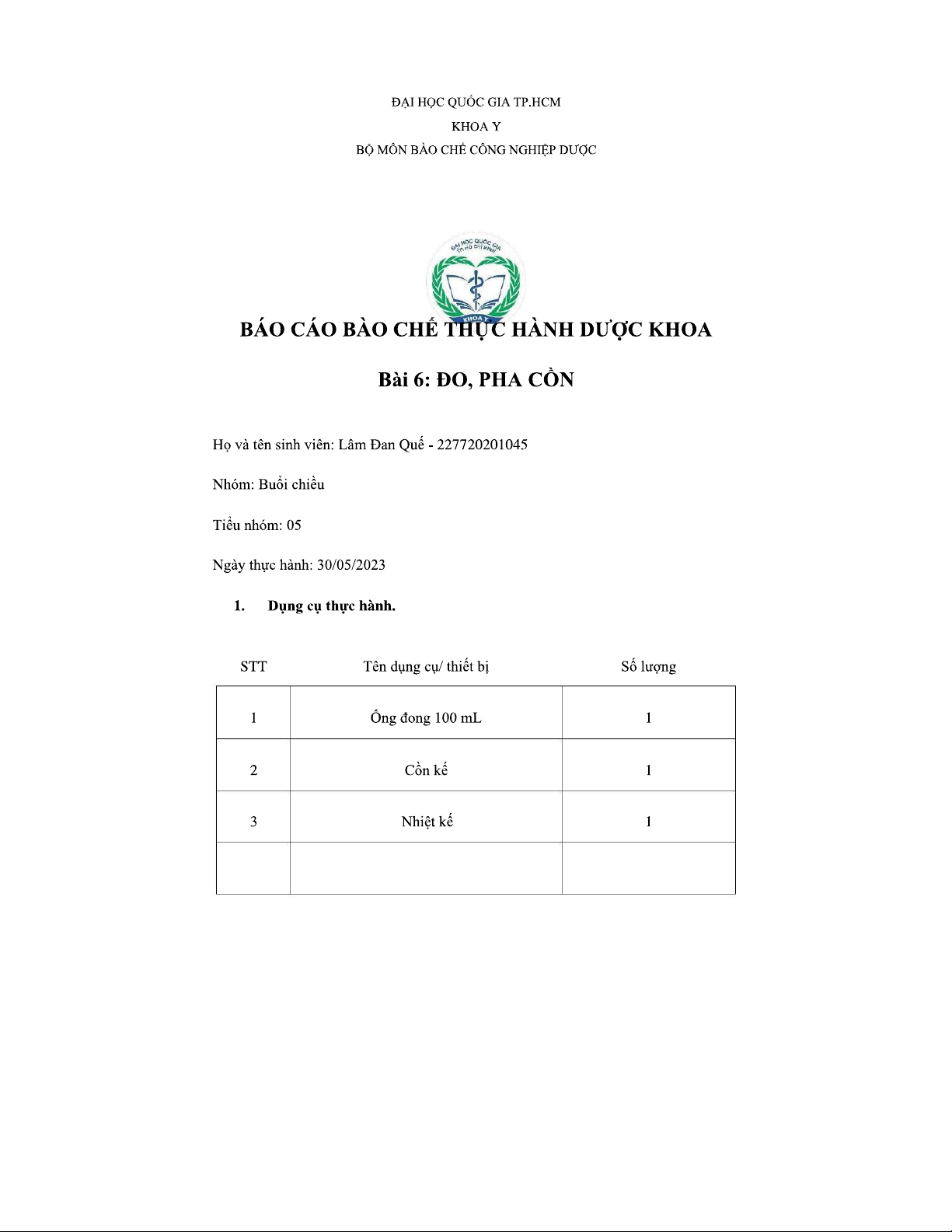 BÀI 6 - ĐO VÀ PHA CỒN - Báo cáo thực hành bào chế DP Khoa Y