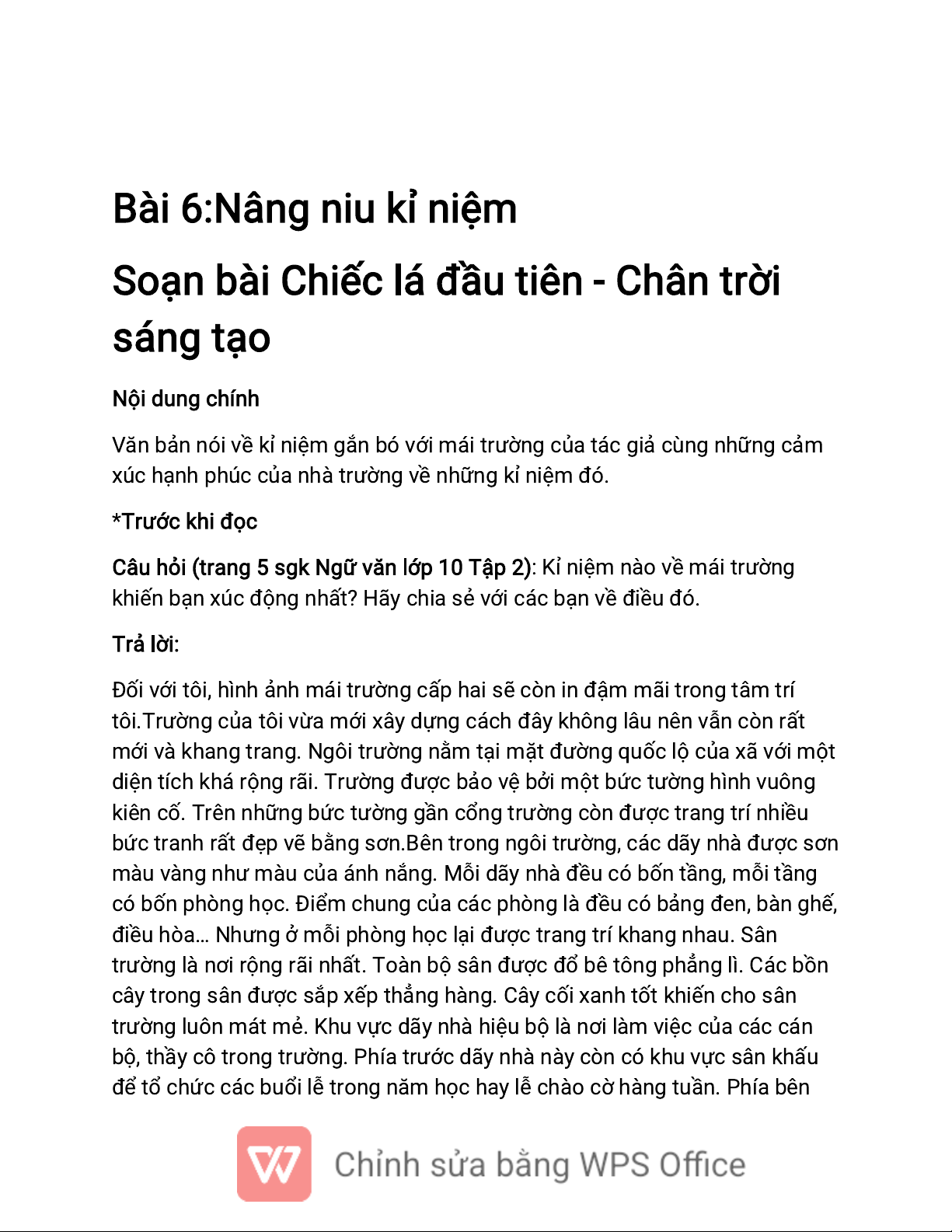 Câu hỏi (trang 5 sgk Ngữ văn lớp 10 Tập 2): Kỉ niệm nào về mái trường