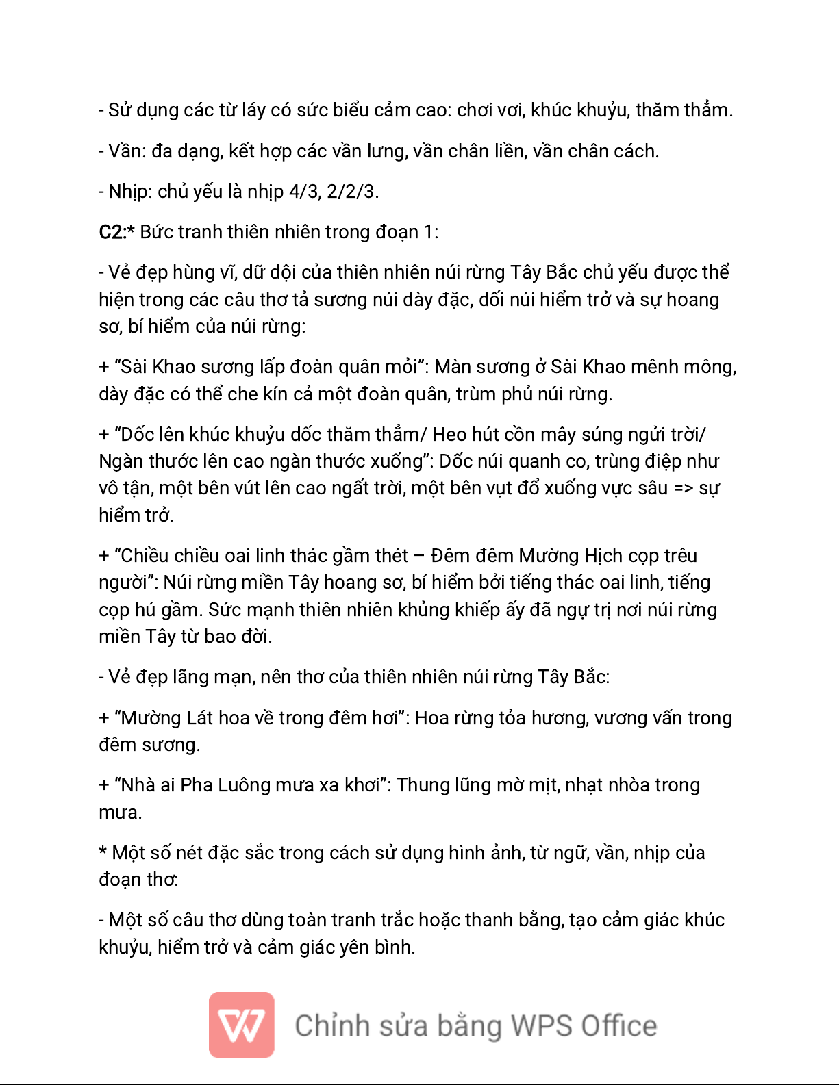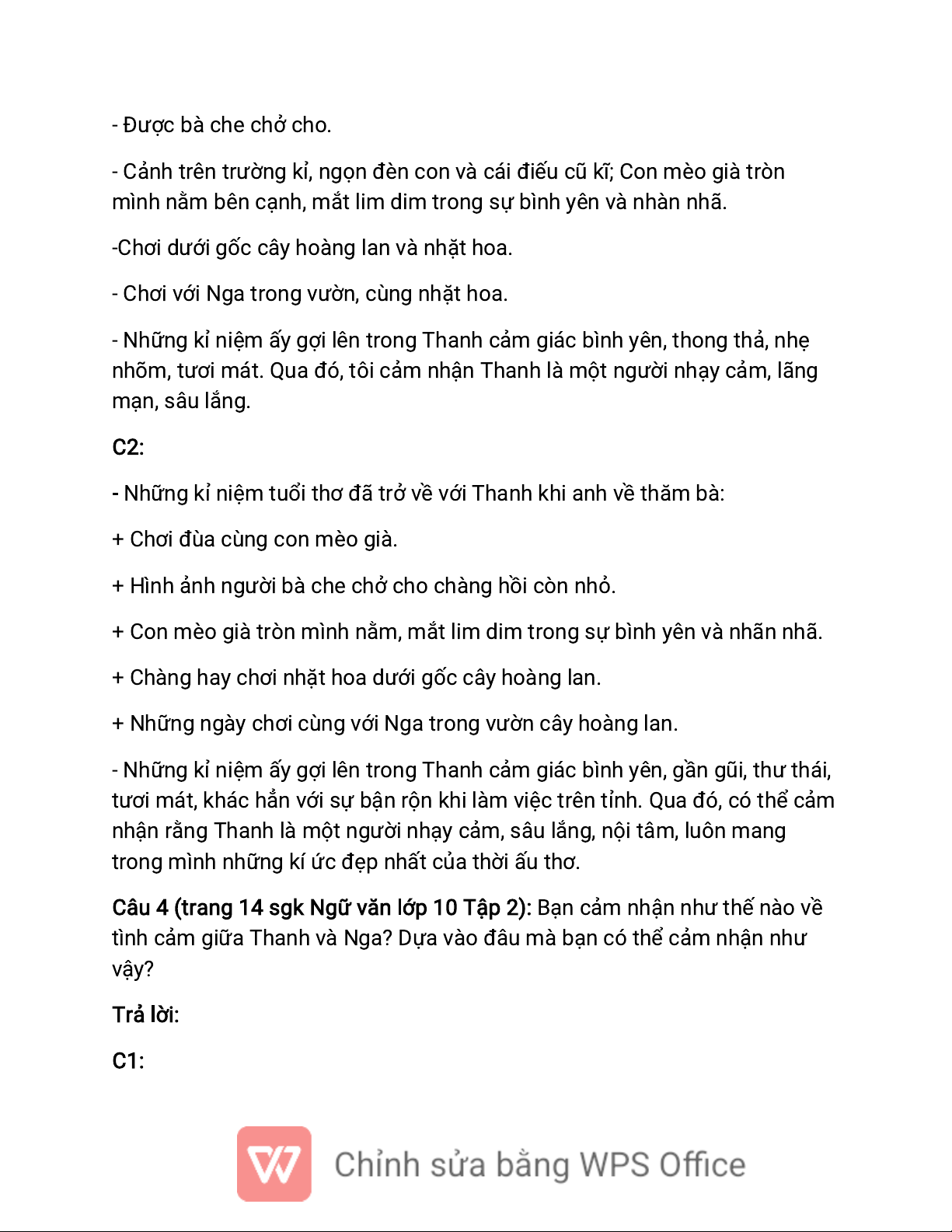 nhõm, tươi mát. Qua đó, tôi cảm nhận Thanh là một người nhạy cảm, lãng mạn, sâu lắng. C2: