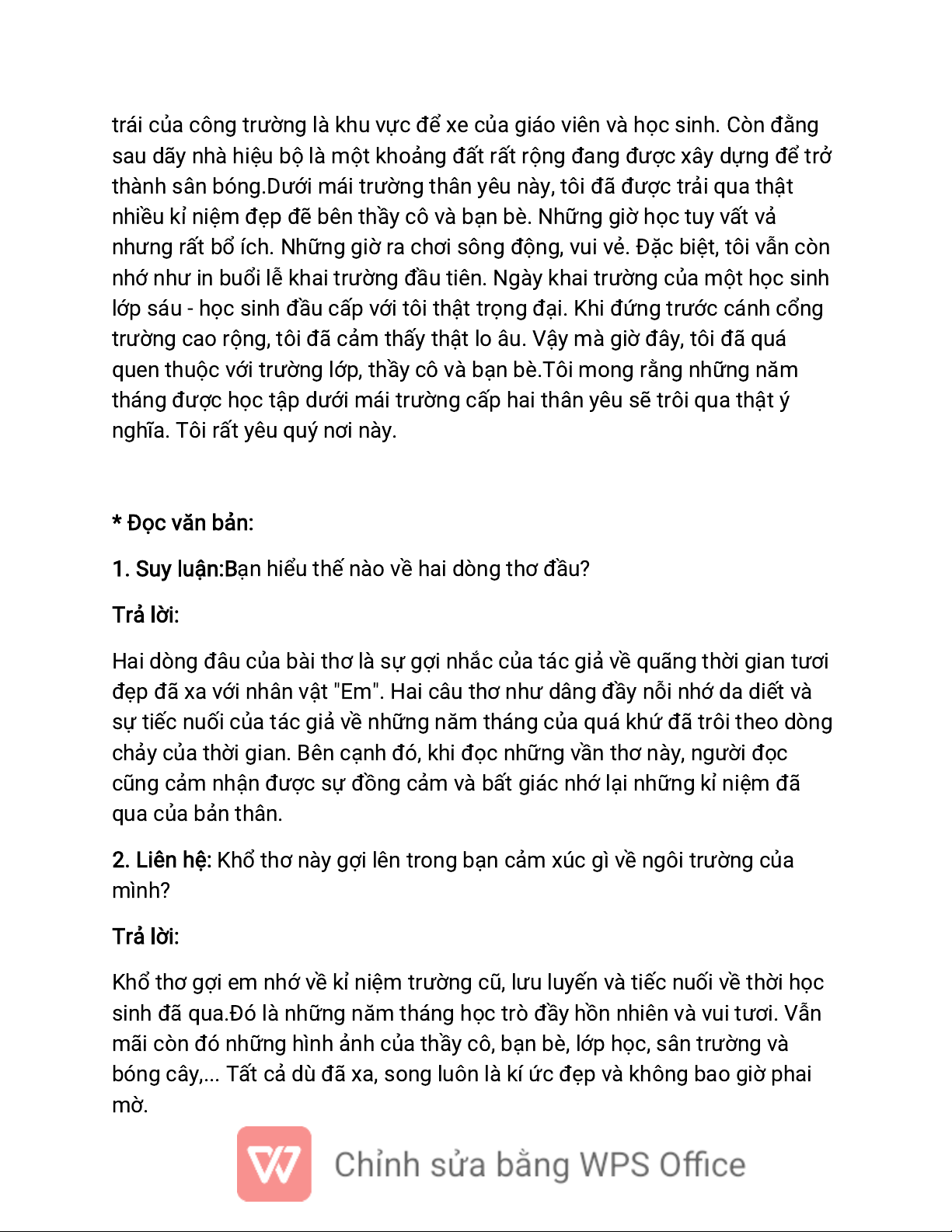 2. Liên hệ: Khổ thơ này gợi lên trong bạn cảm xúc gì về ngôi trường của mình? Trả lời: