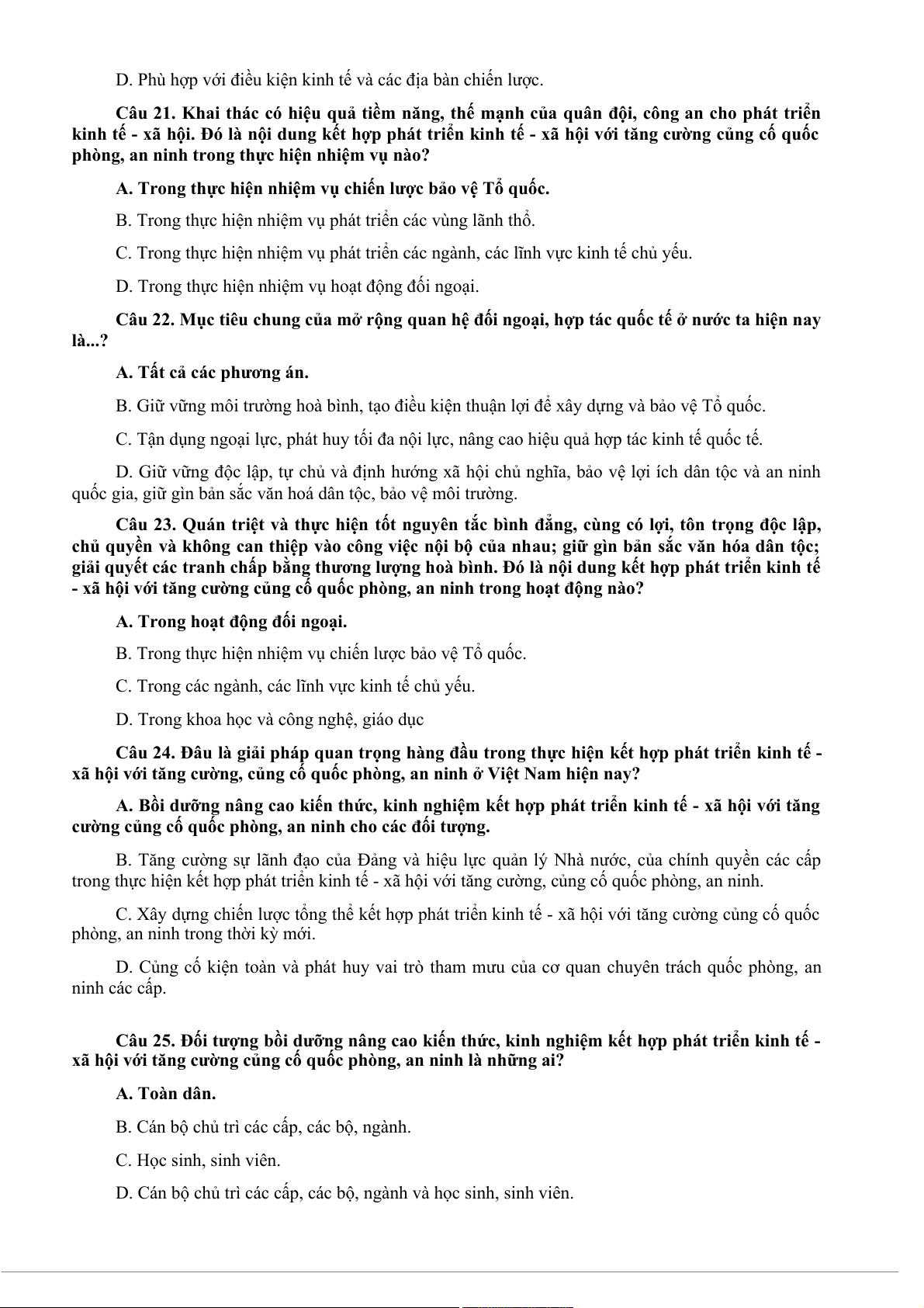 Câu 21. Khai thác có hiệu quả tiềm năng, thế mạnh của quân đội, công an cho phát triển