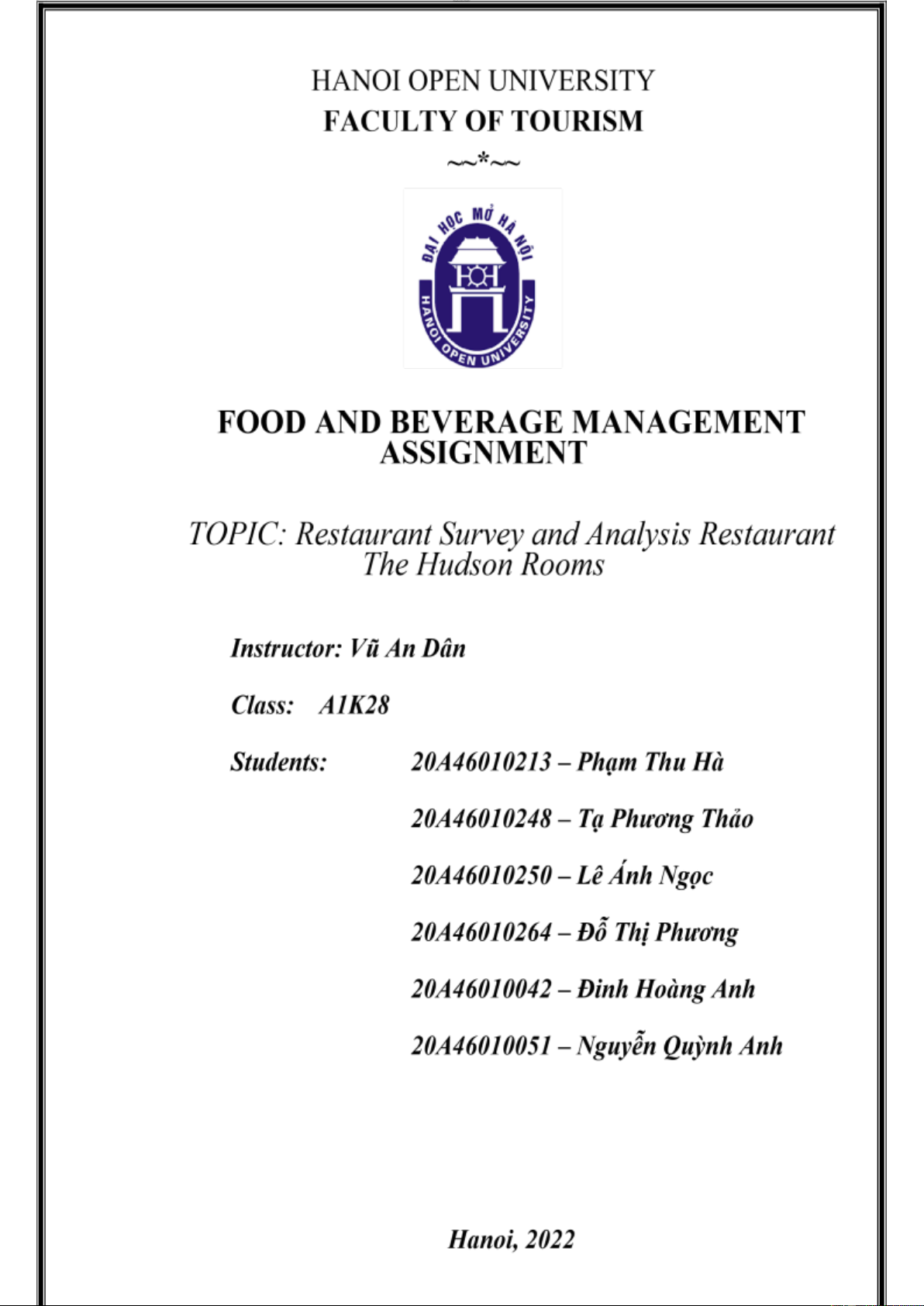 I. Restaurant Operation and Theme (by: Đinh Hoàng Anh) _______________ 6 2 lOMoAR cPSD| 47708777