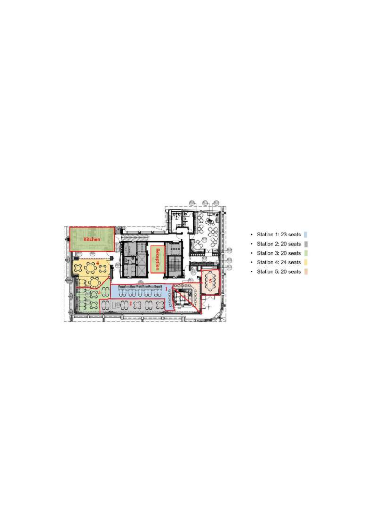 The restaurant is divided into 5 sations, each station is handled by a server. • Station 1: 34 seats • Station 2: 34 seats • Station 3: 14 seats • Station 4: 15 seats • Station 5: 10 seats