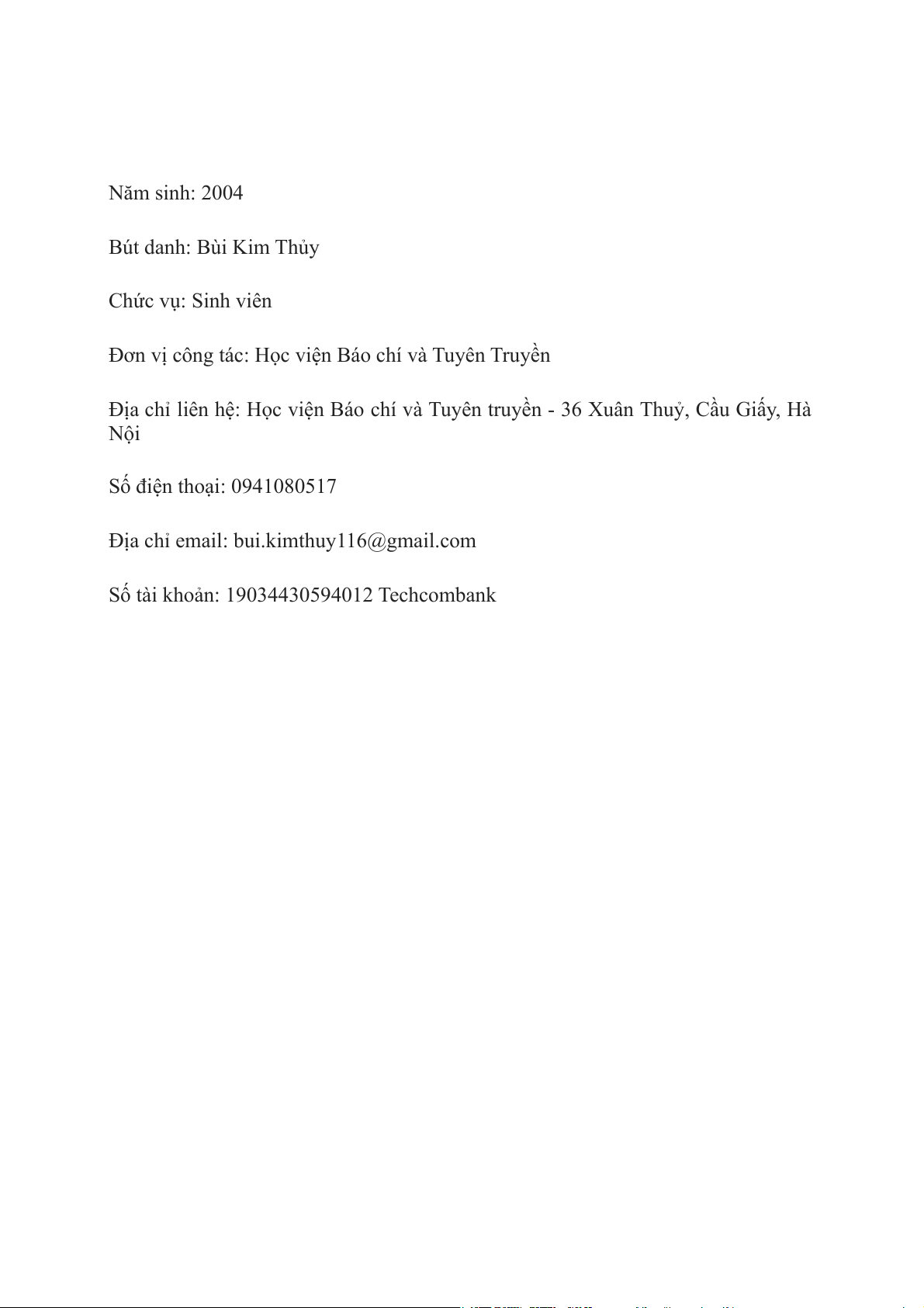 thông tin xấu độc, phản cảm, gây hậu quả tiêu cực trong xã hội. Năm sinh: 2004 Bút danh: Bùi Kim Thủy Chức vụ: Sinh viên