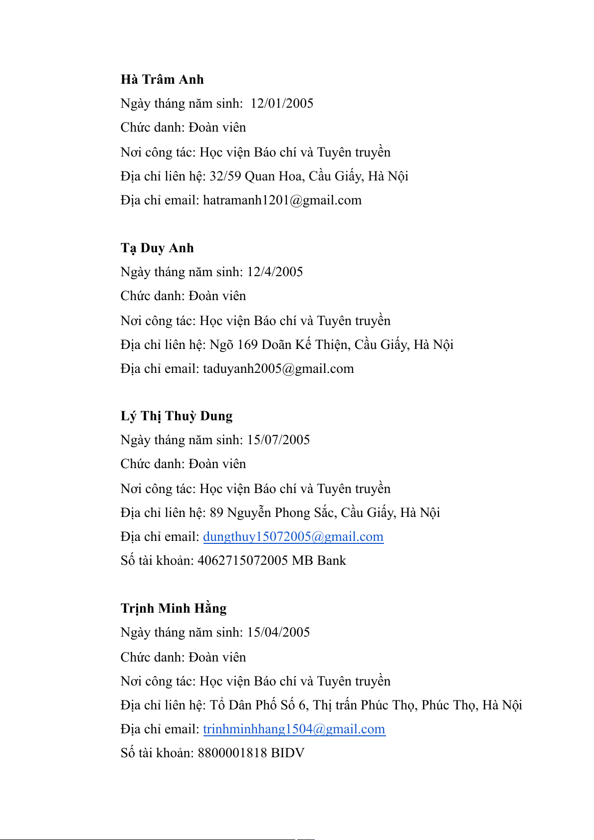 Ngày tháng năm sinh: 15/04/2005 Chức danh: Đoàn viên