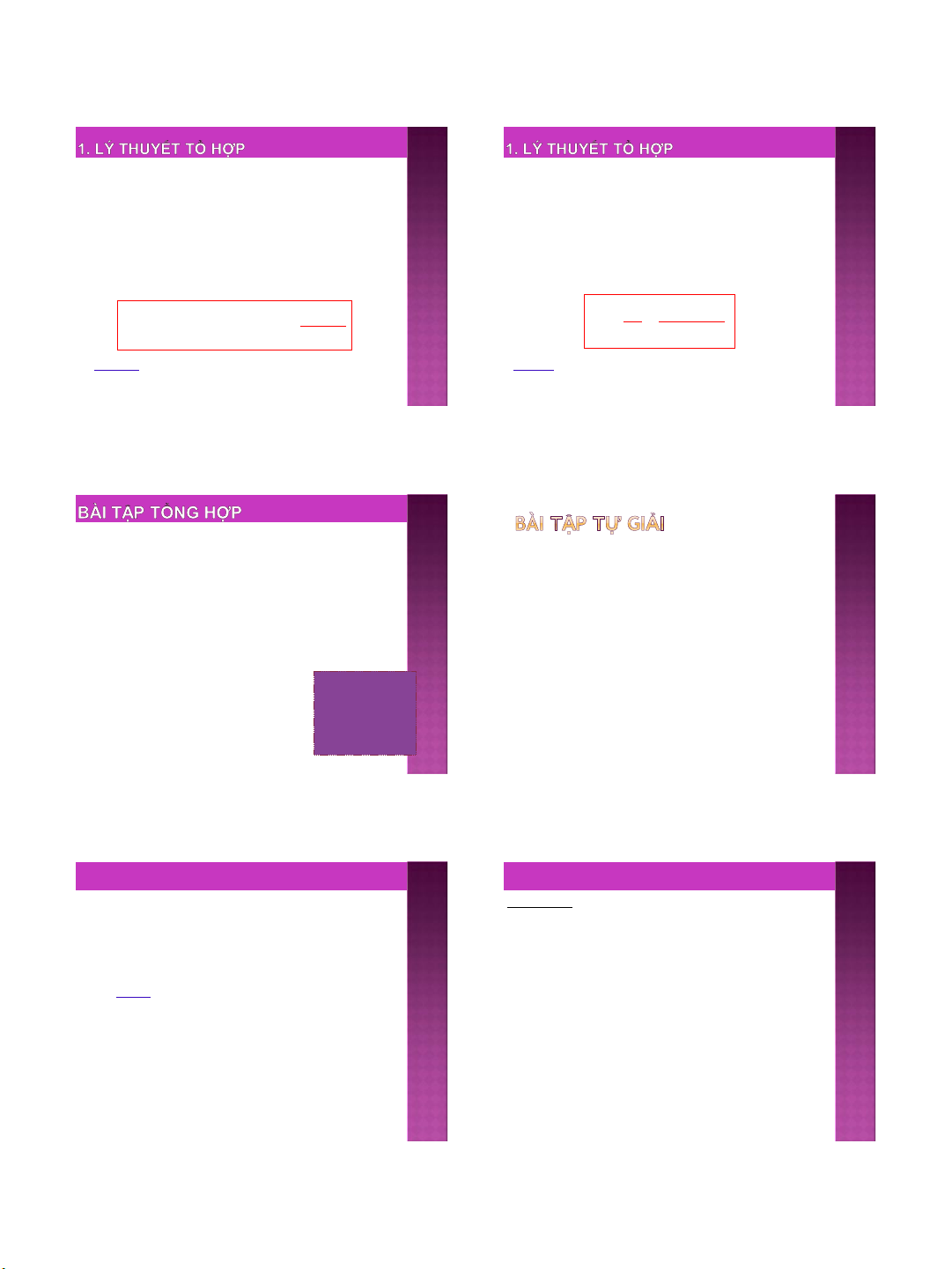 d/ Trong 3 SP lấy ra có không quá 2 xấu? n=C310 – C33 =119 9 10 1. LÝ THUYẾT TỔ HỢP