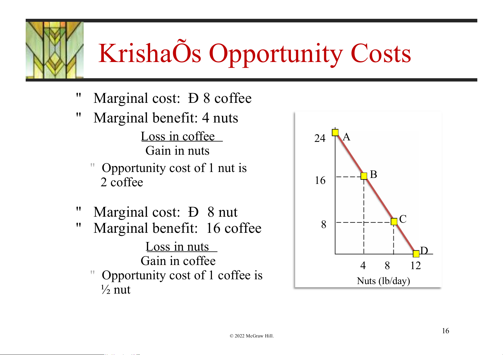 KrishaÕs Production Possibilities " Two goods: coffee and nuts 3 Work 6 hours per day " 1 hour of labor 24 A = 4 pounds of coffee OR = 2 pounds of nuts ay) B 3 Graph shows options 16 (lb/d " Negative slope ffee Co 8 C D 4 8 12 Nuts (lb/day) 15 © 2022 McGraw Hill. KrishaÕs Opportunity Costs " Marginal cost: Ð 8 coffee " Marginal benefit: 4 nuts Loss in coffee 24 A Gain in nuts