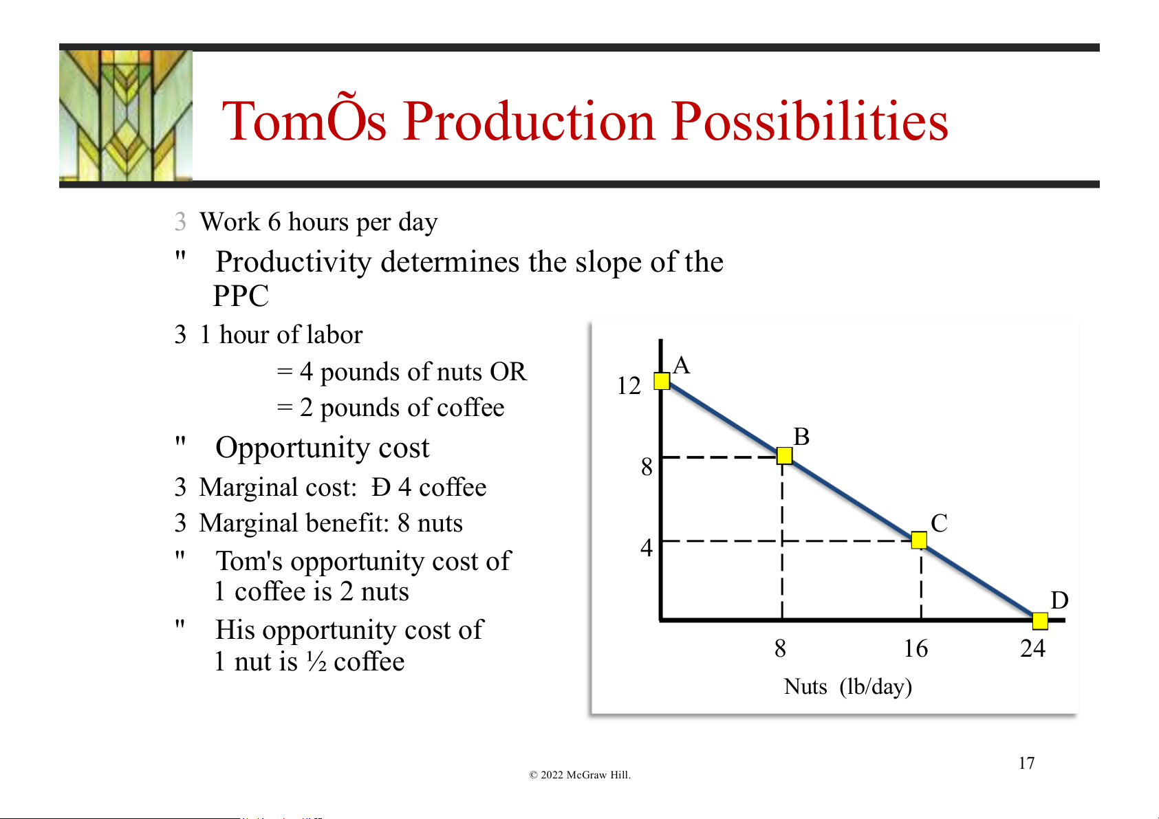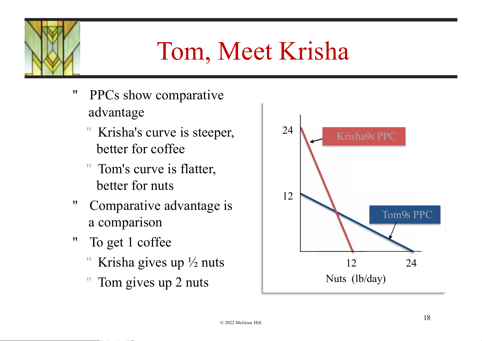 " Productivity determines the slope of the PPC 3 1 hour of labor = 4 pounds of nuts OR A 12 = 2 pounds of coffee " Opportunity cost B ay) 8 3 Marginal cost: Ð 4 coffee 3 Marginal benefit: 8 nuts (lb/d C " Tom's opportunity cost of ffee 4 1 coffee is 2 nuts Co D " His opportunity cost of 1 nut is ½ coffee 8 16 24 Nuts (lb/day) 17 © 2022 McGraw Hill. Tom, Meet Krisha " PPCs show comparative advantage " Krisha's curve is steeper, 24 Krisha9s PPC better for coffee " Tom's curve is flatter, ay) better for nuts 12 " Comparative advantage is fee (lb/d a comparison Tom9s PPC Cof " To get 1 coffee " Krisha gives up ½ nuts 12 24 " Tom gives up 2 nuts Nuts (lb/day) 18 © 2022 McGraw Hill. Gains from Specialization and Trade