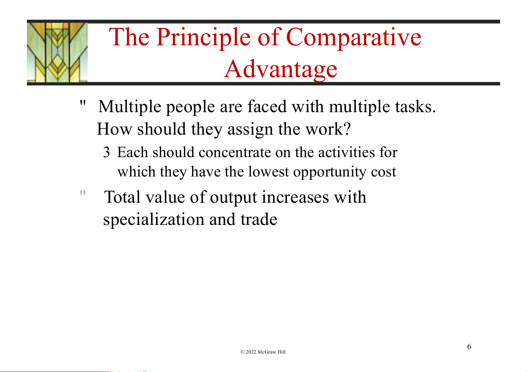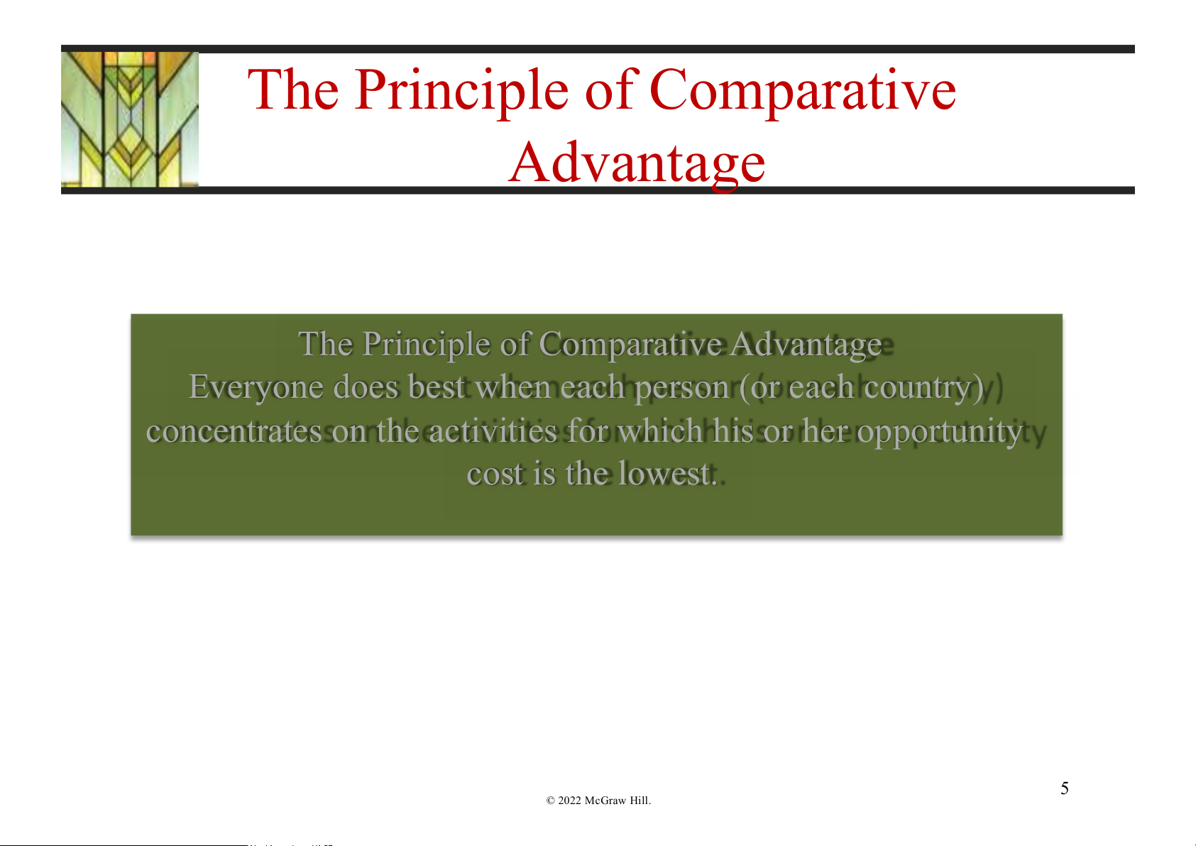 concentrates on the activities for which his or her opportunity cost is the lowest. 5 © 2022 McGraw Hill. The Principle of Comparative Advantage