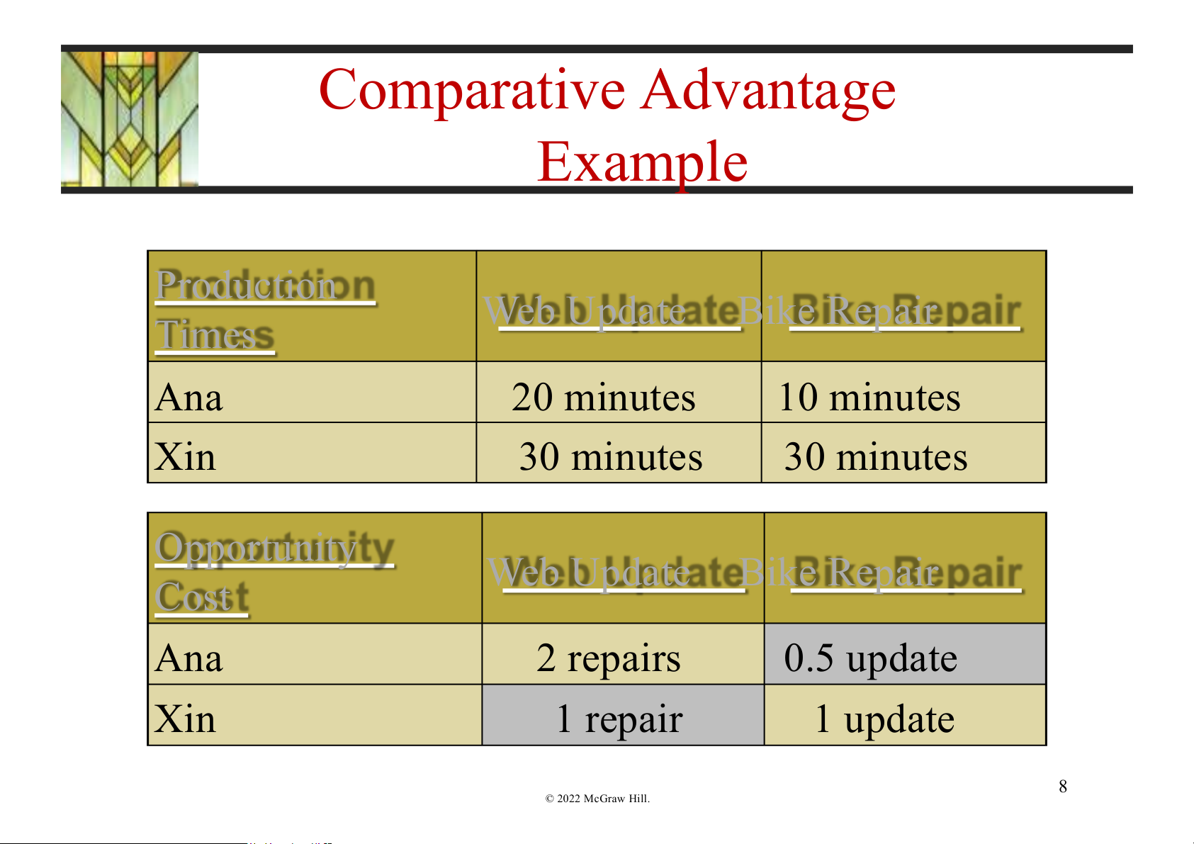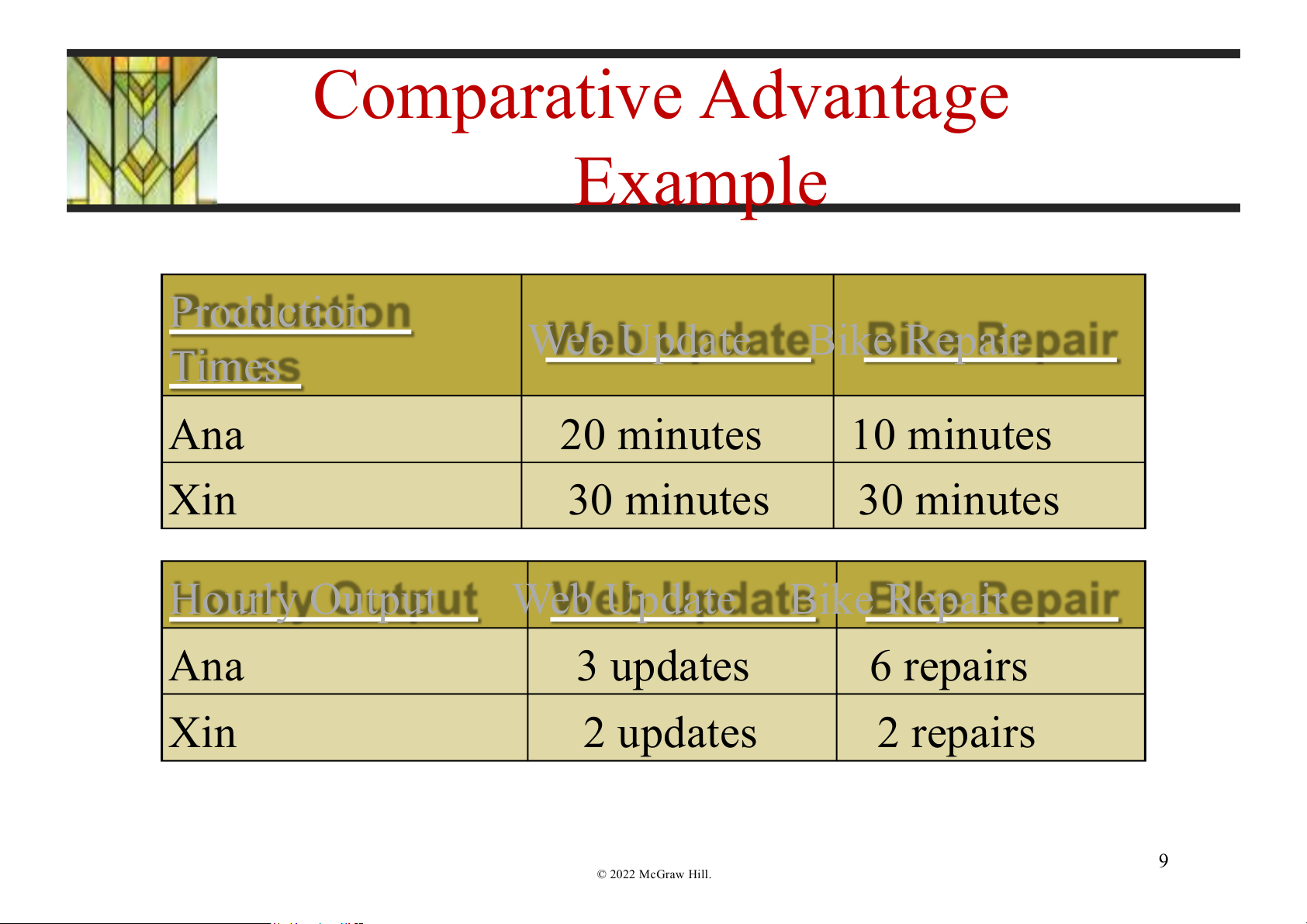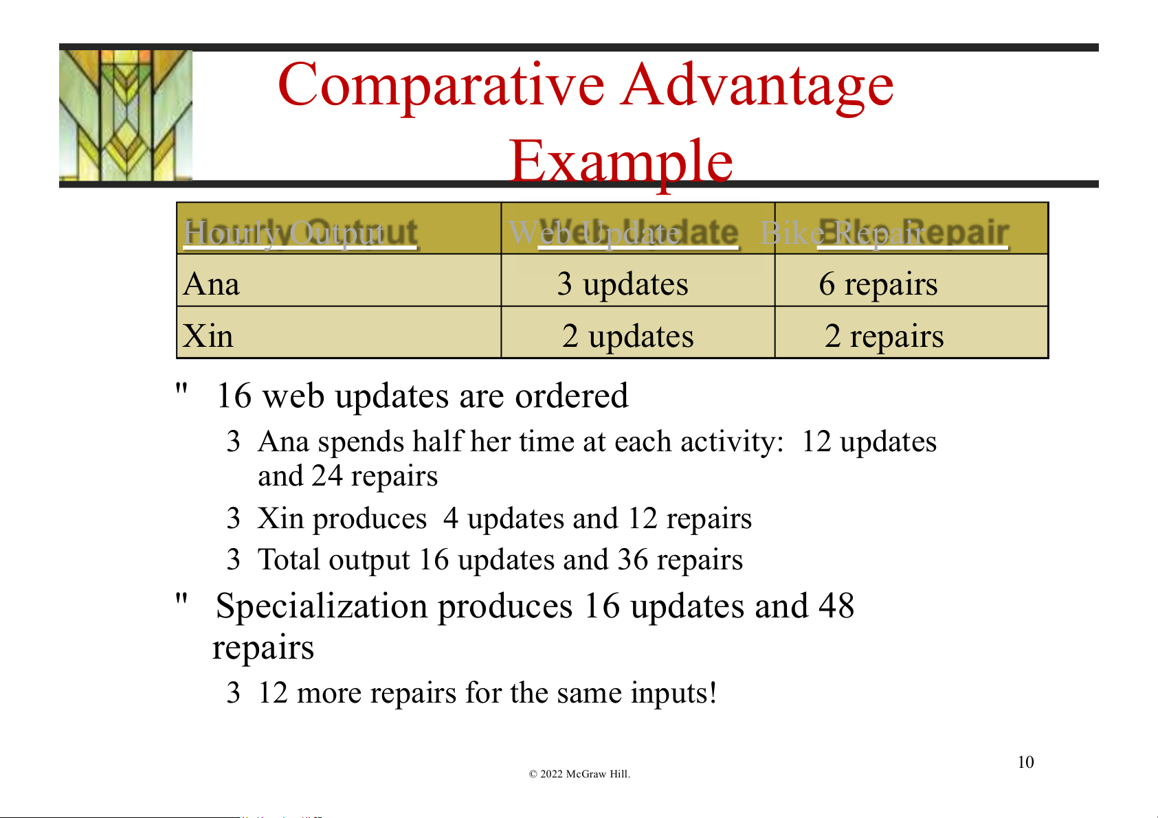 " Total value of output increases with specialization and trade 6 © 2022 McGraw Hill. Comparative Advantage Example Production Web Update Bike Repair Times Ana 20 minutes 10 minutes Xin 30 minutes 30 minutes