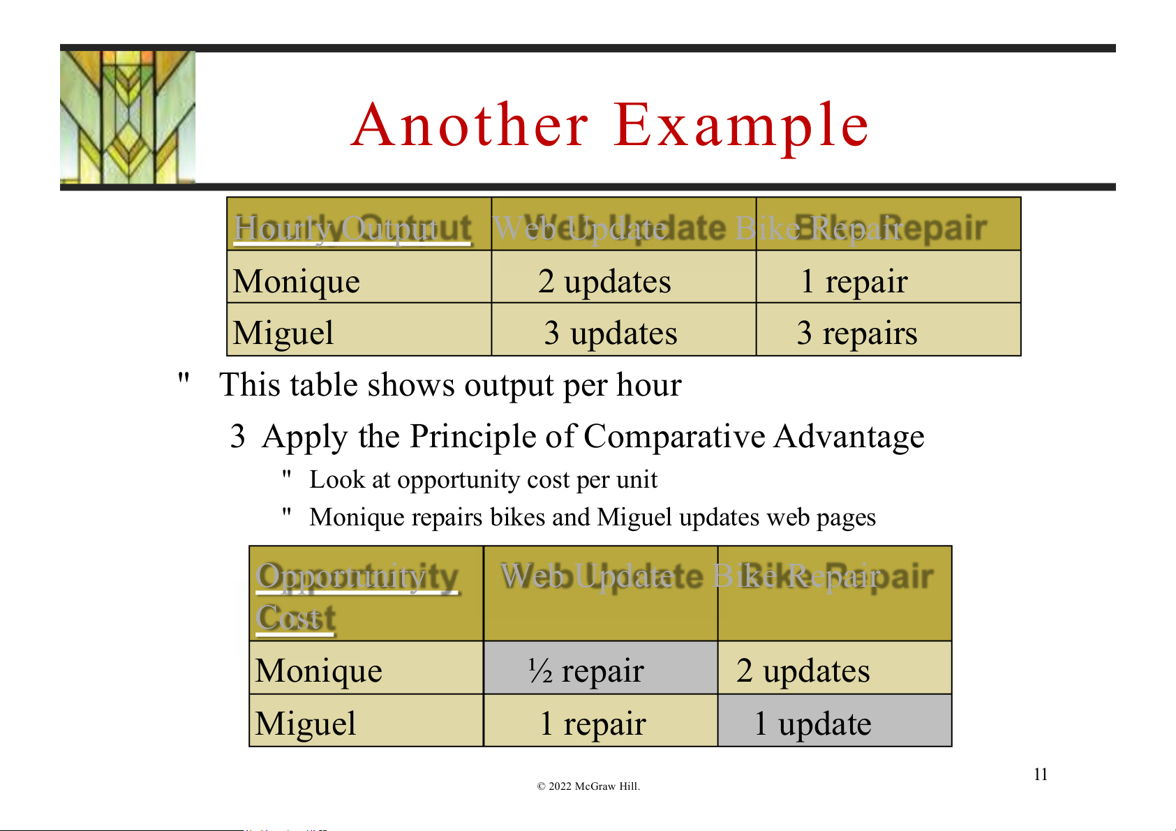 3 So who has a comparative advantage in what? 7 © 2022 McGraw Hill. Comparative Advantage Example Production Web Update Bike Repair Times Ana 20 minutes 10 minutes Xin 30 minutes 30 minutes Opportunity Web Update Bike Repair Cost Ana 2 repairs 0.5 update Xin 1 repair 1 update 8 © 2022 McGraw Hill. Comparative Advantage Example Production Web Update Bike Repair Times Ana 20 minutes 10 minutes Xin 30 minutes 30 minutes Hourly Output Web Update Bike Repair Ana 3 updates 6 repairs Xin 2 updates 2 repairs 9 © 2022 McGraw Hill. Comparative Advantage Example Hourly Output Web Update Bike Repair Ana 3 updates 6 repairs Xin 2 updates 2 repairs " 16 web updates are ordered