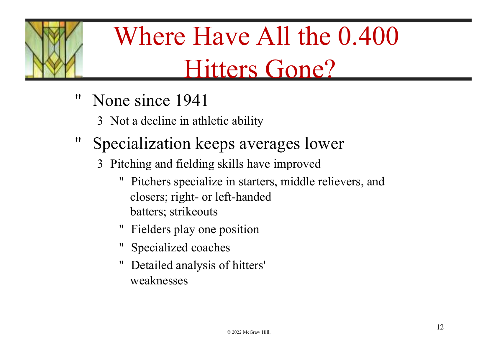 " Monique repairs bikes and Miguel updates web pages Opportunity Web Update Bike Repair Cost Monique ½ repair 2 updates Miguel 1 repair 1 update 11 © 2022 McGraw Hill. Where Have All the 0.400 Hitters Gone? " None since 1941