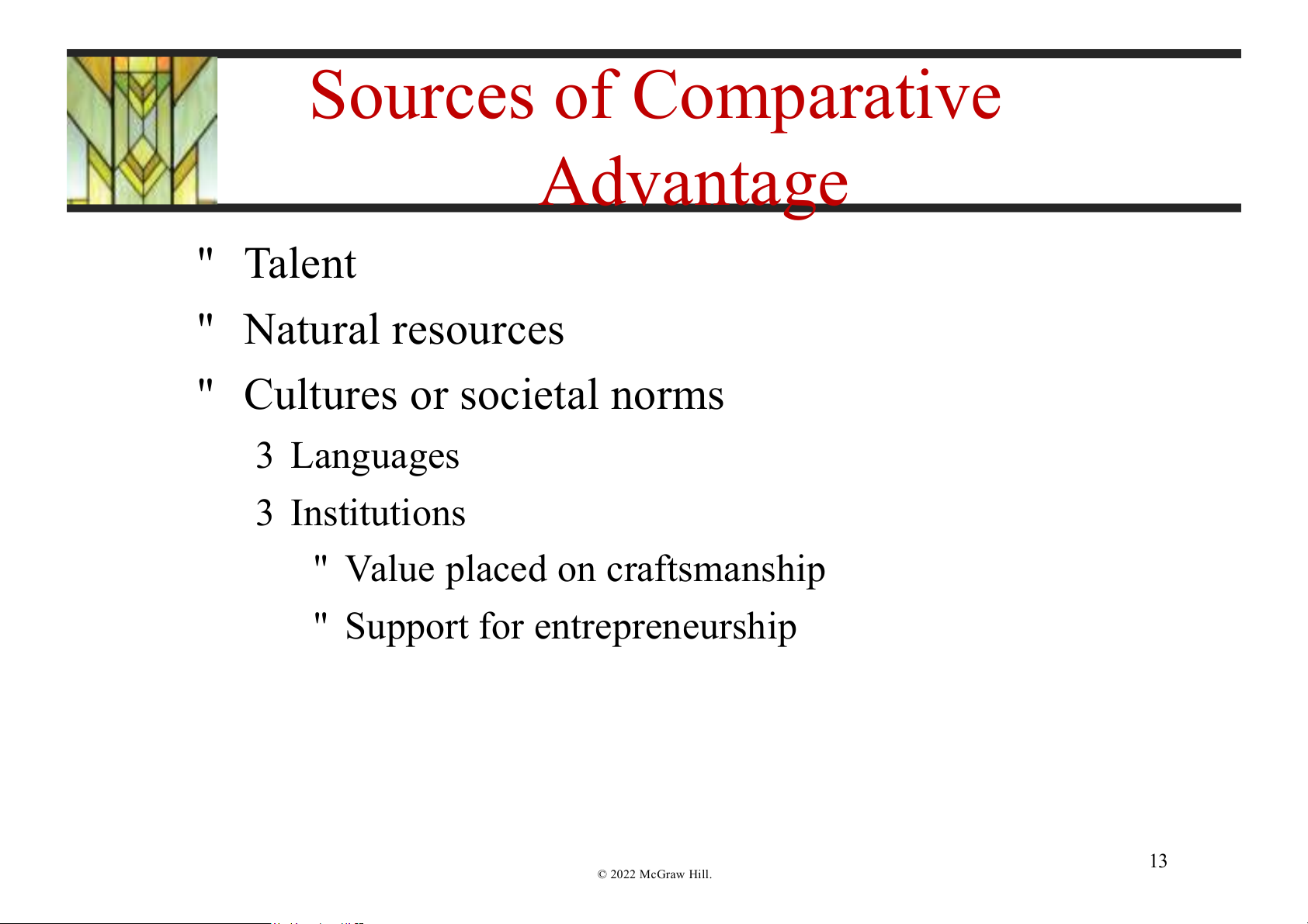 " Detailed analysis of hitters' weaknesses 12 © 2022 McGraw Hill. Sources of Comparative Advantage " Talent " Natural resources " Cultures or societal norms 3 Languages 3 Institutions