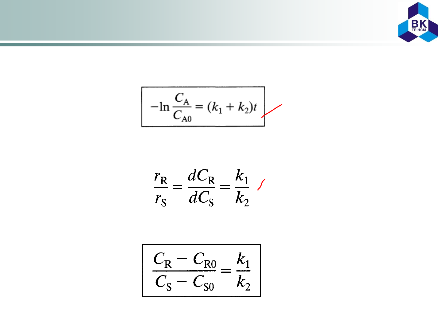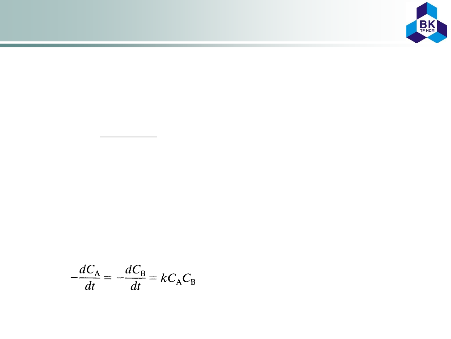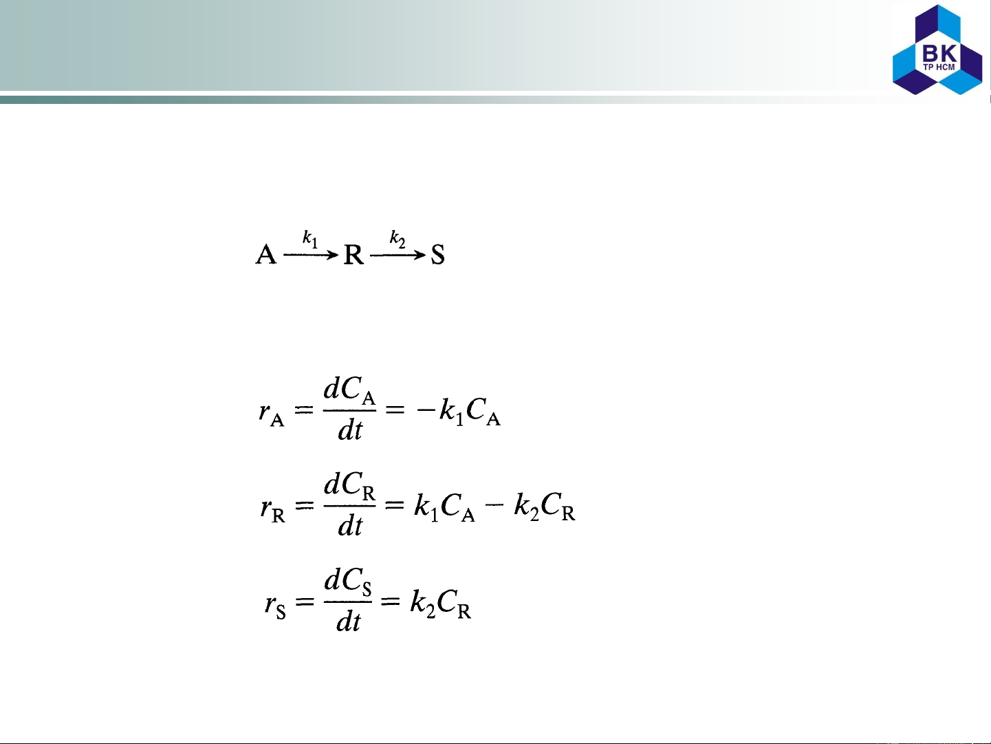 Reversible Reactions: • First order: A R: r = k C – k C k in [s-1] 1 A 2 R • Second order: A + B R + S: r = k C C – k C C k in [m3 mol-1s-1] 1 A B 2 R S 2A 2R: r = k C 2 – k C 2 k in [m3 mol-1s-1] 1 A 2 R 2A R + S: r = k C 2 – k C C k in [m3 mol-1s-1] 1 A 2 R S A + B 2R: r = k C C – k C 2 k in [m3 mol-1s-1] 1 A B 2 R