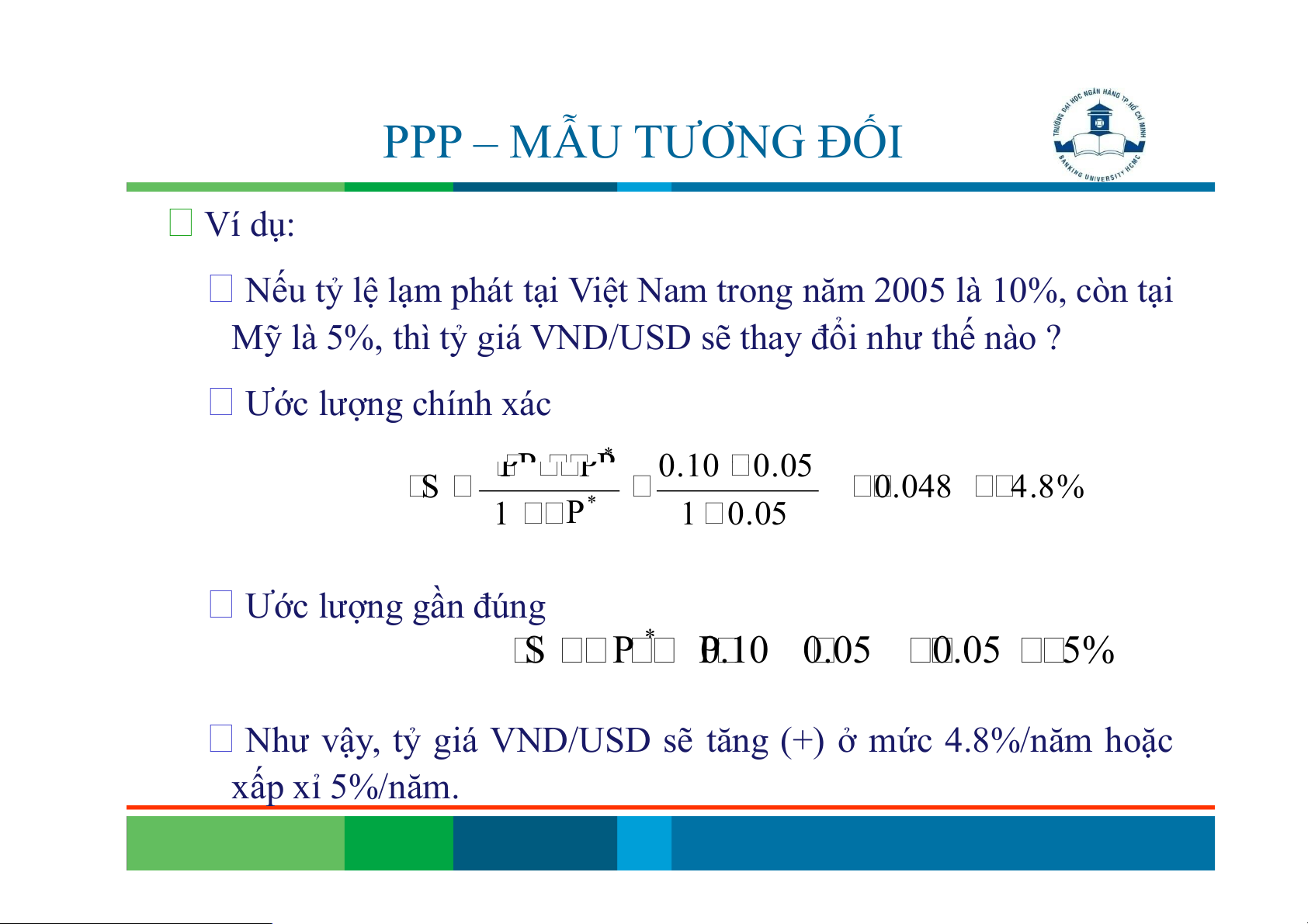 Mỹ là 5%, thì tỷ giá VND/USD sẽ thay đổi như thế nào ? Ước lượng chính xác * P P P P 0.10 1 0.05 0 S 0.048 4.8% 1 * P 1 0.05 Ước lượng gần đúng * S P . 0P 10 . 0 05 . 0 05 % 5