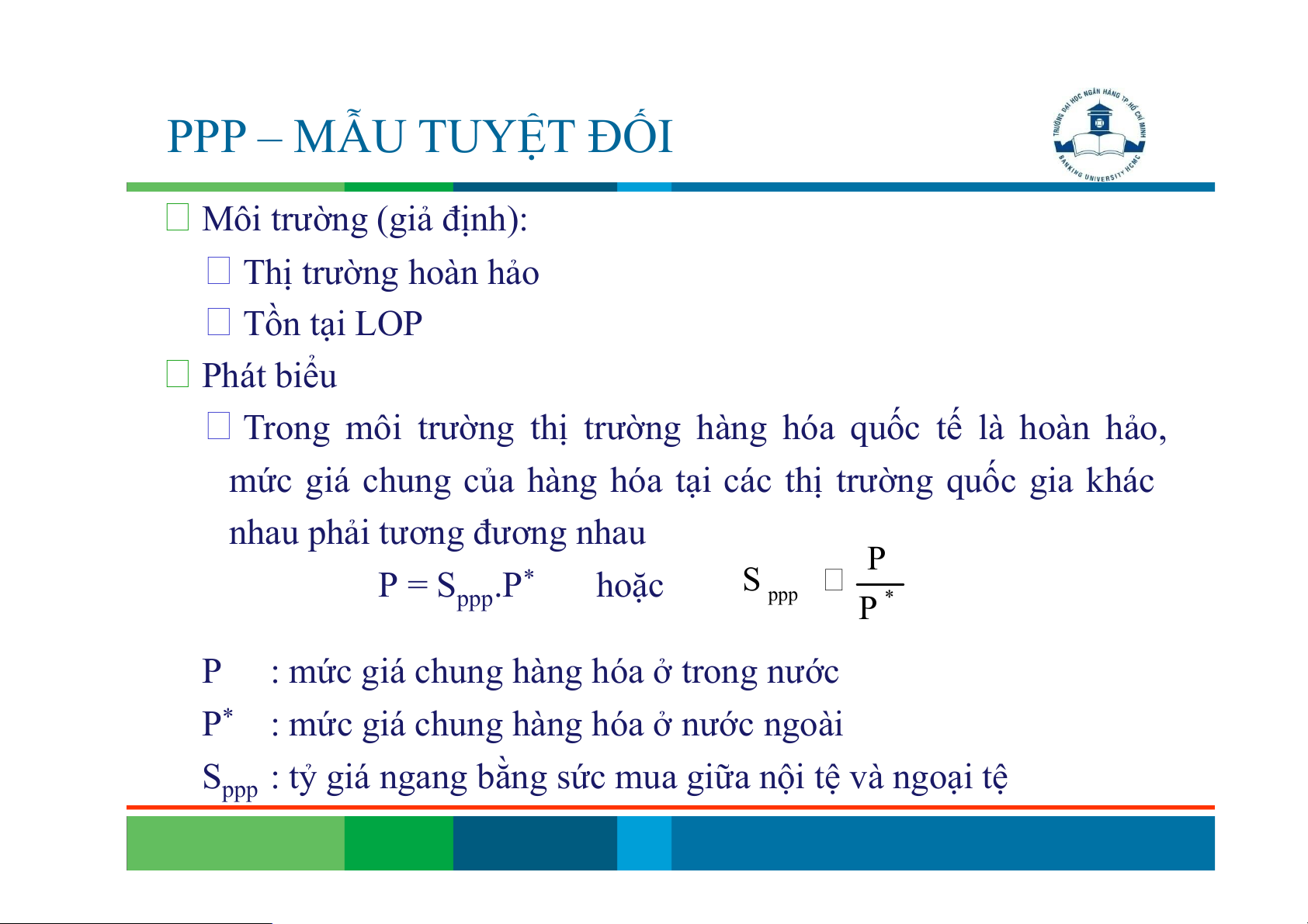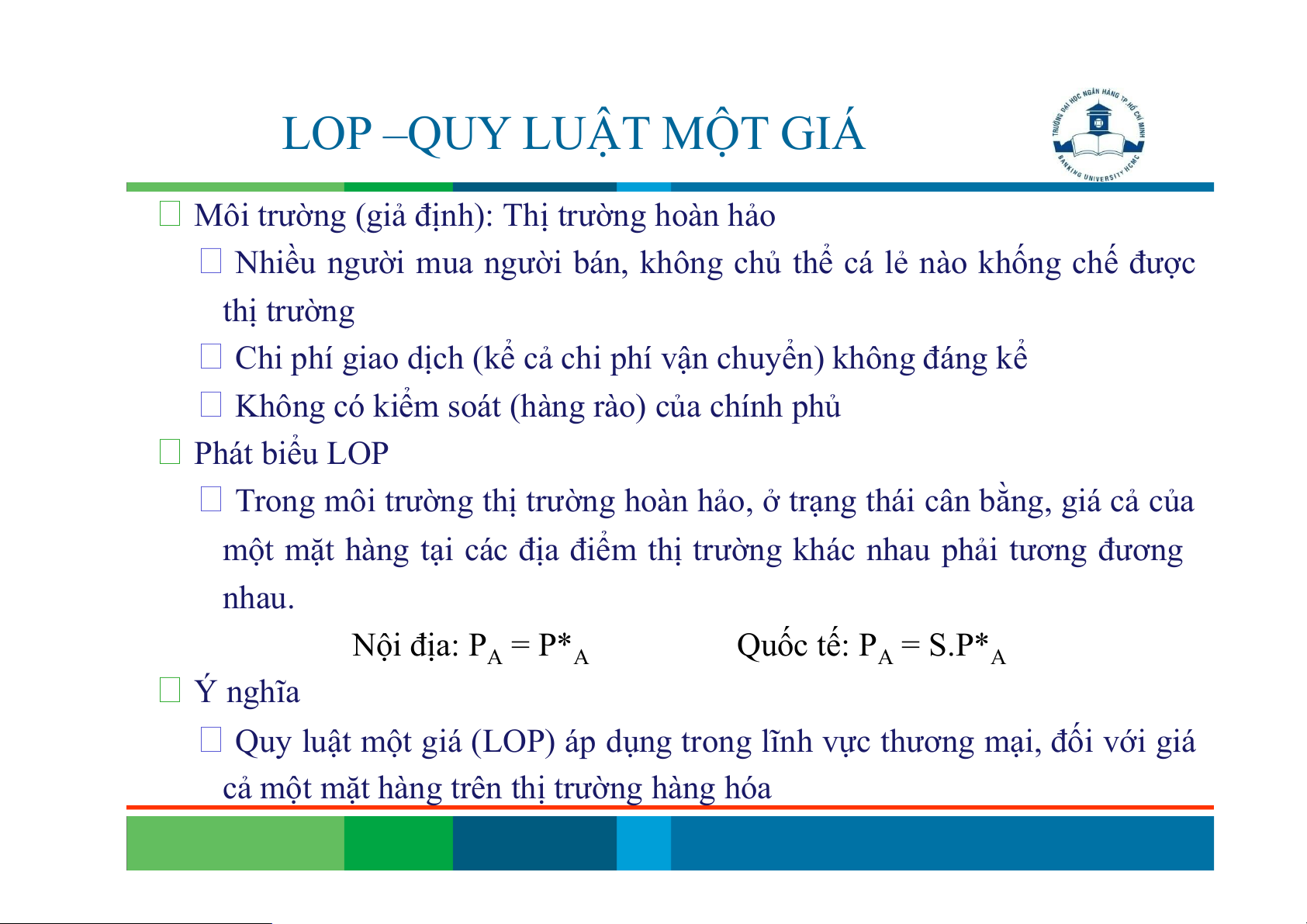 một mặt hàng tại các địa điểm thị trường khác nhau phải tương đương nhau. Nội địa: P = P* Quốc tế: P = S.P* A A A A Ý nghĩa