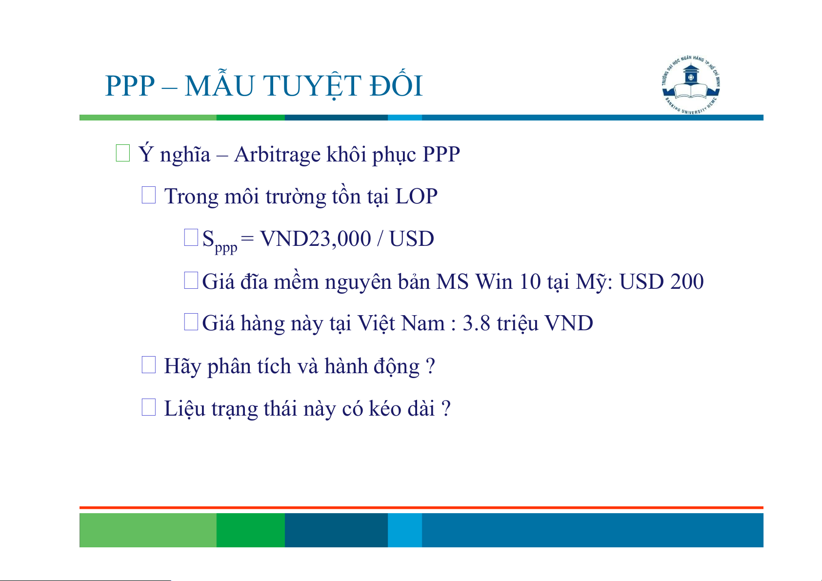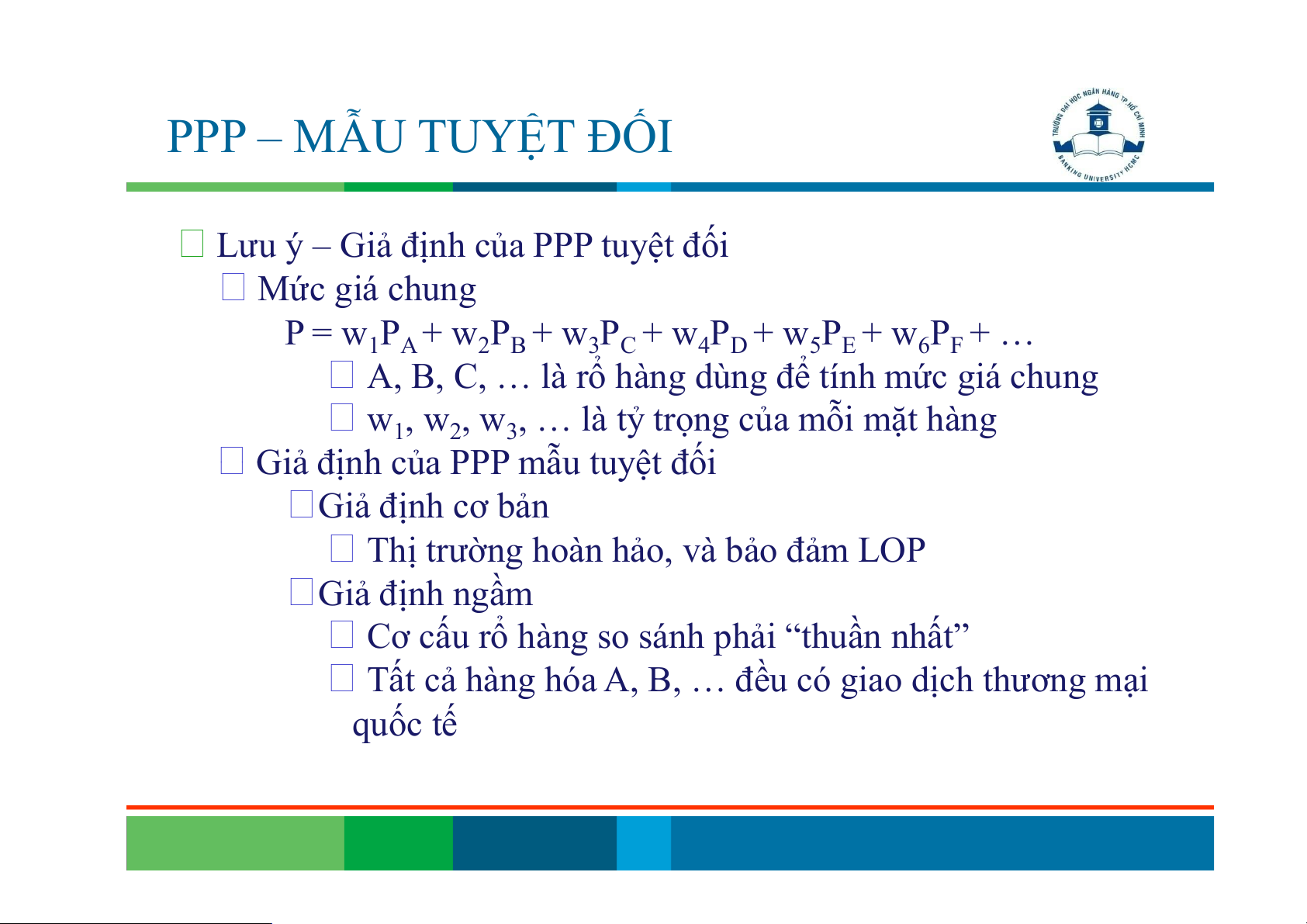 Lưu ý – Giả định của PPP tuyệt đối Mức giá chung P = w + w + w + w + w + w + … 1PA 2PB 3PC 4PD 5PE 6PF