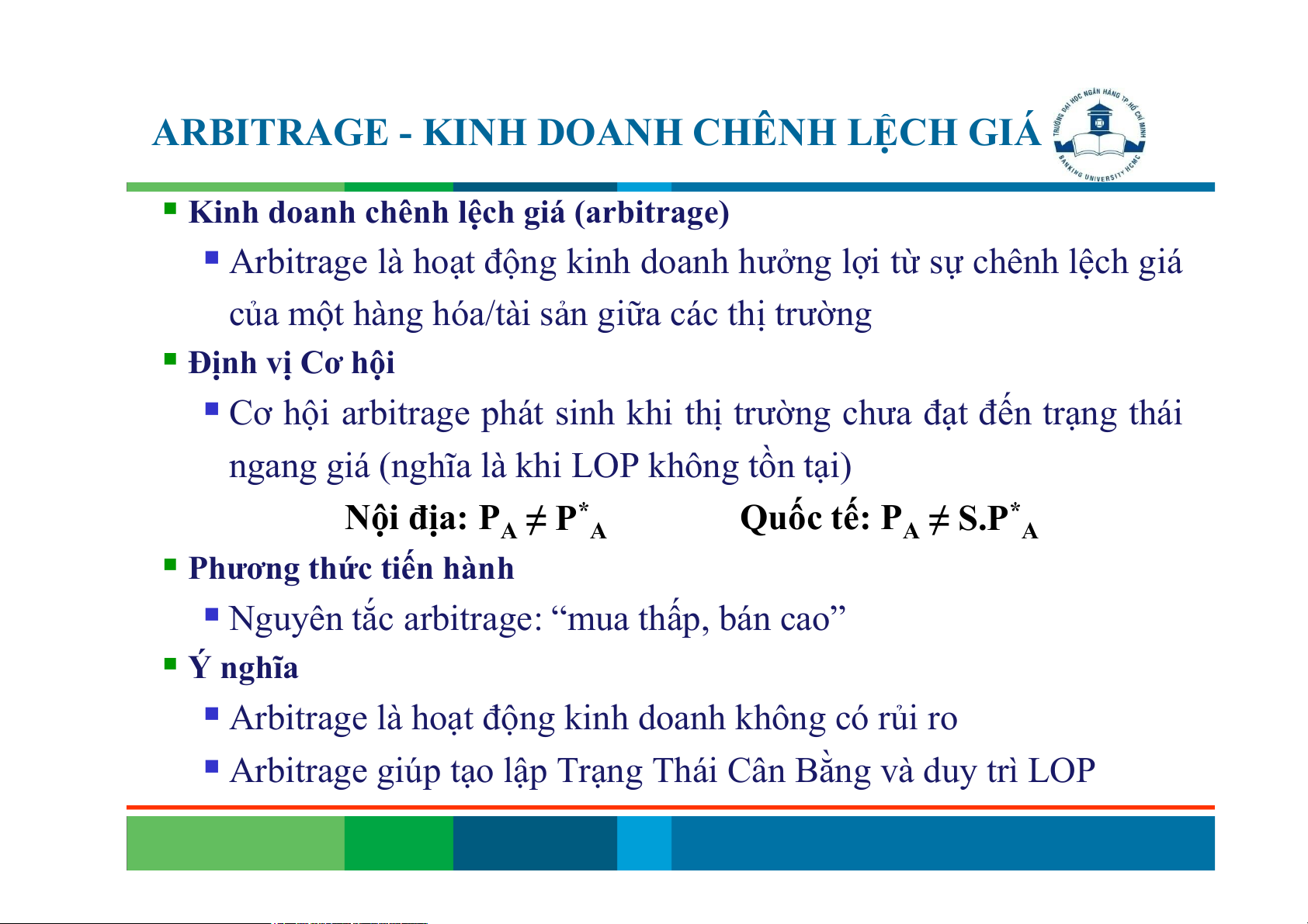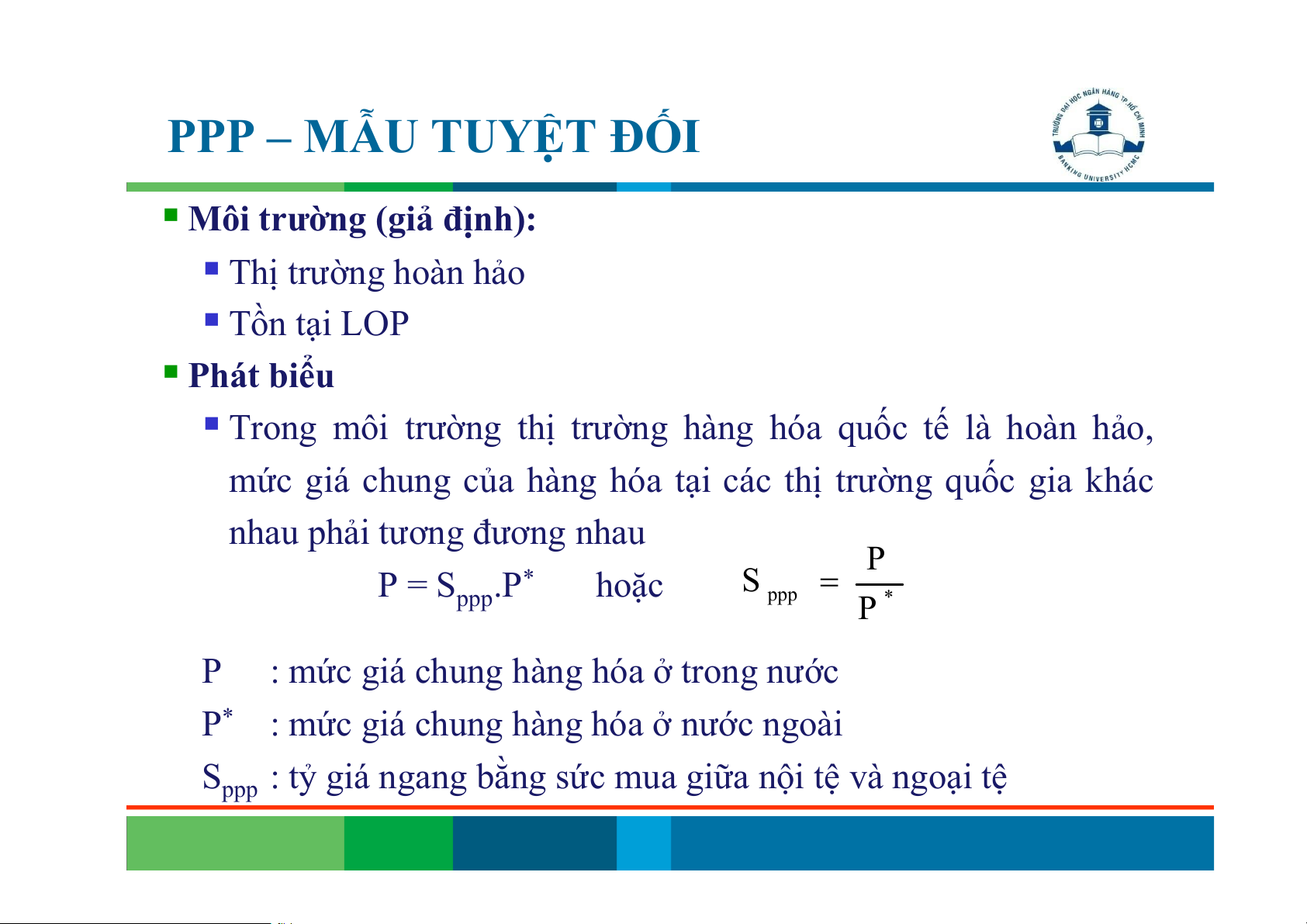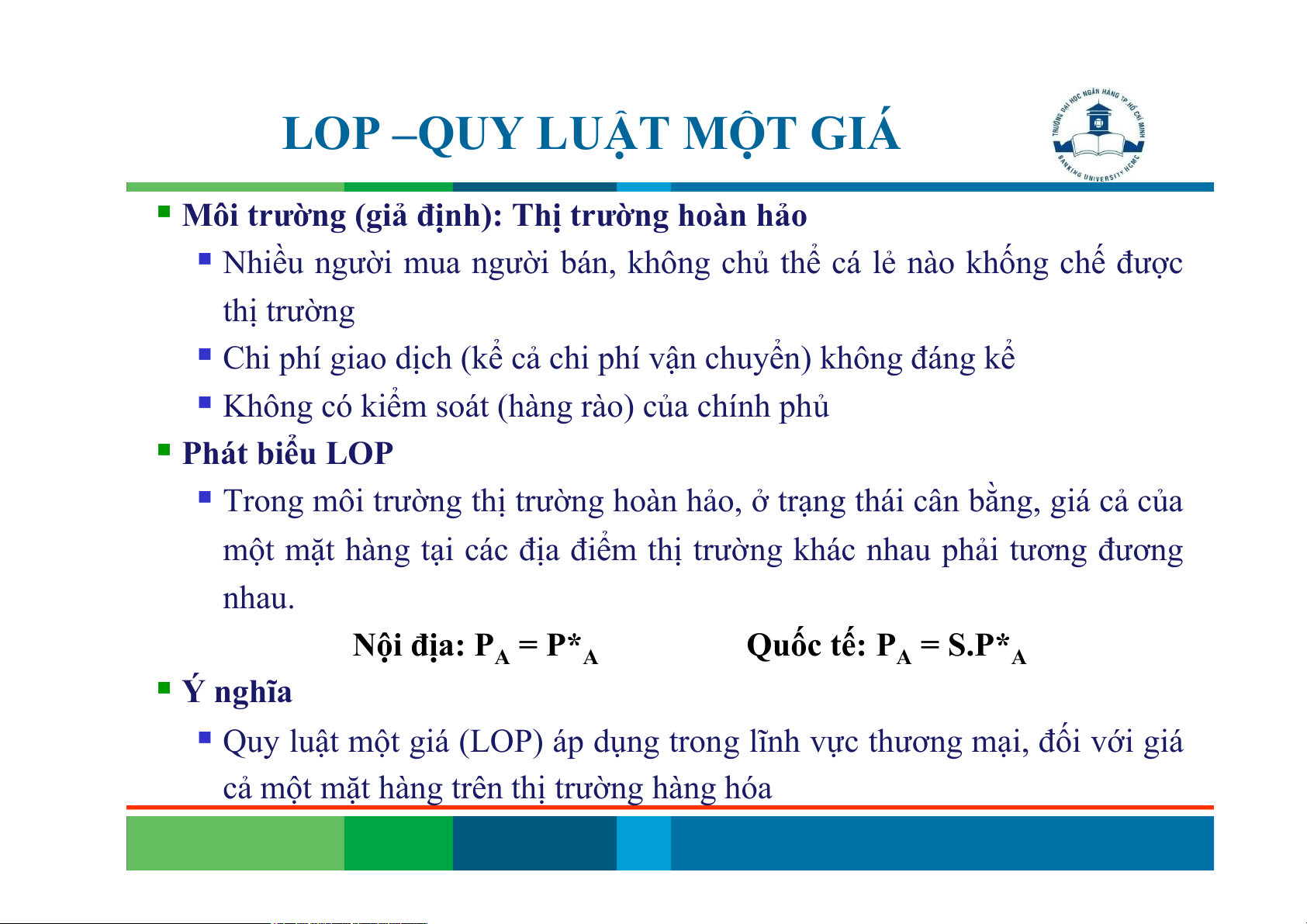 một mặt hàng tại các địa điểm thị trường khác nhau phải tương đương nhau. Nội địa: P = P* Quốc tế: P = S.P* A A A A Ý nghĩa