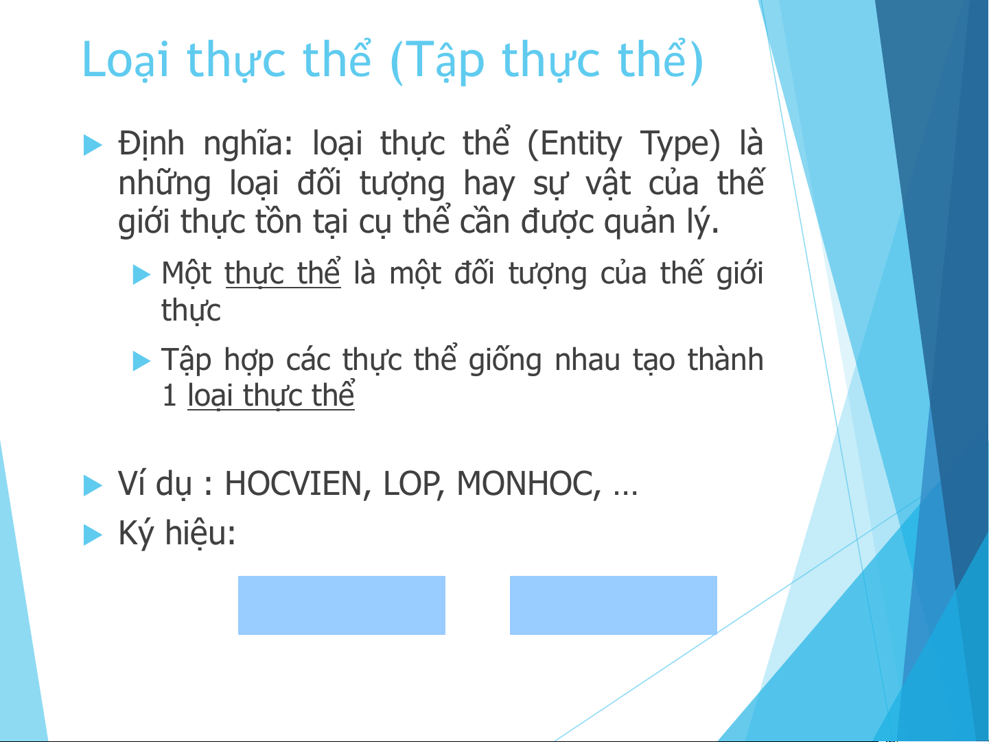 u Ví dụ : HOCVIEN, LOP, MONHOC, … u Ký hiệu: HOCVIEN LOP Thực thể (Entity)