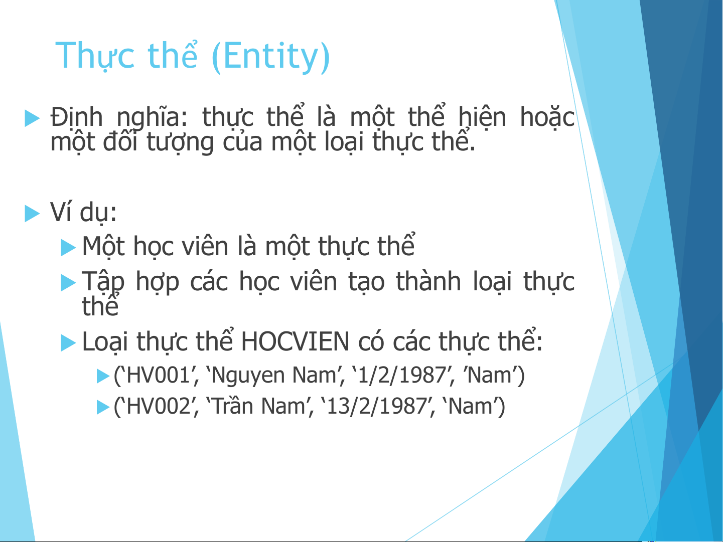 u (‘HV002’, ‘Trần Nam’, ‘13/2/1987’, ‘Nam’) Thuộc tính