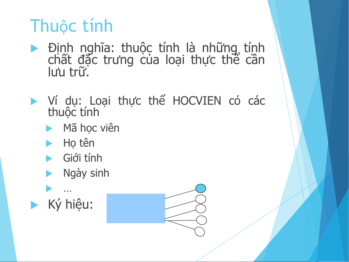 u Ví dụ: Loại thực thể HOCVIEN có các thuộc tính u Mã học viên u Họ tên u Giới tính u Ngày sinh u … Mahv u Ký hiệu: Hoten HOCVIEN Gioitinh Ngaysinh Noisinh Các loại thuộc tính